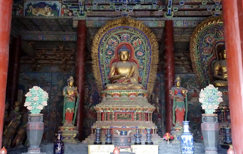 大雄宝殿进深五间,面阔九间。为了使空间宽敞,殿内柱子的配列采用减柱法,尽量减少内柱数目。殿内正中有五尊主佛,人称五方(东南西北中)佛,各统治一方。中间三尊为木雕,左右两尊为泥塑。五方佛两侧的砖台上,立有二十座佛教的护法神,称为二十诸天。清代光绪年间工匠们又在殿内墙壁上绘满了巨幅壁画。