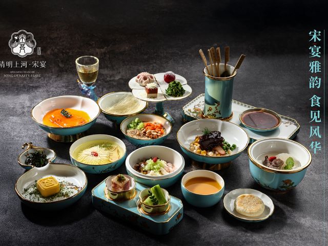 精致宋韵美学:在《清明上河・宋宴》的演出中,菜品设计注重典故与美学,如“菊花豆腐”“鱼跃虹桥”等菜肴搭配官窑、钧窑风格器皿,体现宋人雅趣。同时每道菜均对应演出剧情,形成“视听味”融合的立体体验。