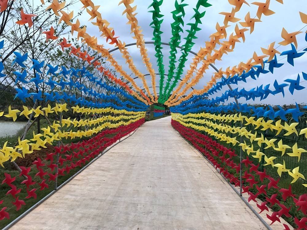 这里有一个风车走廊,大概300米,现在秋光正好,还会有微风吹拂。当有微风吹过这些风车时,他们会发出“呼呼呼”的声音,而且这里的风车的颜色也有很多,当你穿过这条长廊时,仿佛置身于童话世界一般,让人不由的开心起来!
