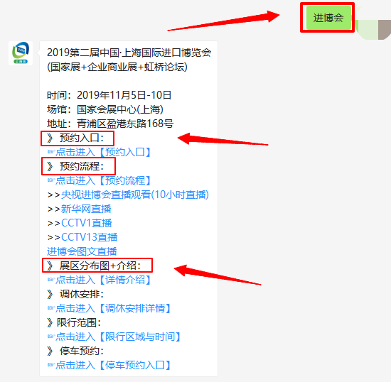 微信搜索关注吃瓜惠玩,输入框回复【进博会】就可获得2019上海进博会观众报名入口,还有更多停车预约,直播地址,展馆展区等信息。