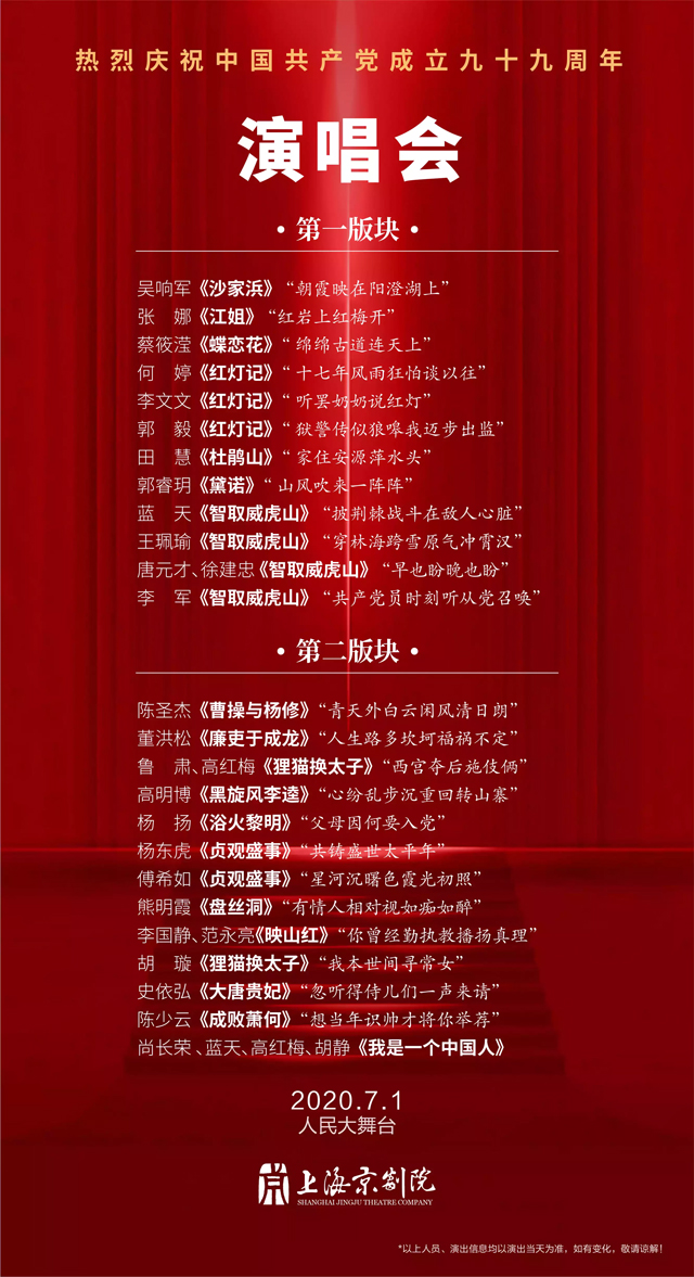热烈庆祝中国共产党成立九十九周年演唱会上海站时间:2020-07-01 19:15