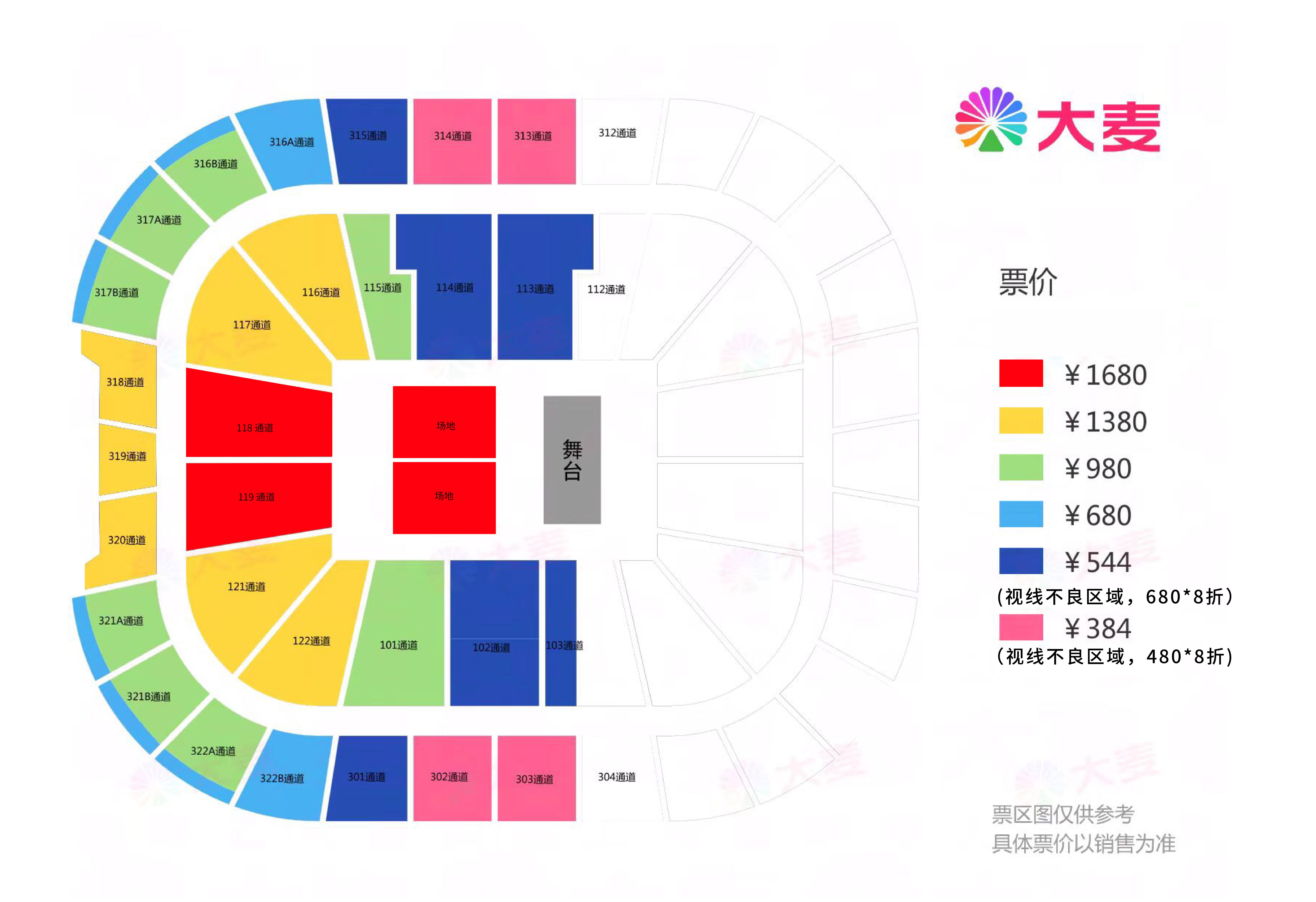 关于2023年毛不易北京演唱会门票多少钱一张,本次毛不易北京演唱会门票票价被划分为6个档位,即384元票面价、544元票面价、680元票面价、980元票面价、1380元票面价以及1680元票面价。其中,前5个票面为看台票,最后1个票面为内场票。座位图分布如下: