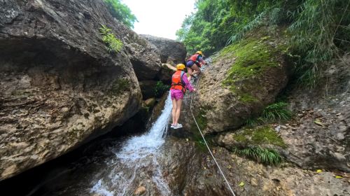 未被人工雕琢的多级瀑布群是弯弓崖的灵魂。水流从数十米高的悬崖飞泻而下,形成层层叠叠的白色帘幕,在阳光折射下幻化出彩虹。游客可沿着溪流溯溪而上,在瀑布下的深潭游泳、打水仗,或借助绳索攀爬至瀑布顶端,感受“飞流直下”的震撼。