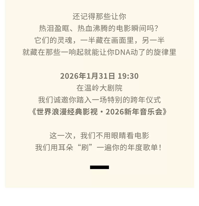 还记得那些让你热泪盈眶、热血沸腾的电影瞬间吗?它们的灵魂,一半藏在画面里,另一半就藏在那些一响起就能让你DNA动了的旋律里。2026年1月31日19:30,在温岭大剧院,世界浪漫经典影视大片温岭新年交响音乐会,给你一场不一样的新年音乐会。