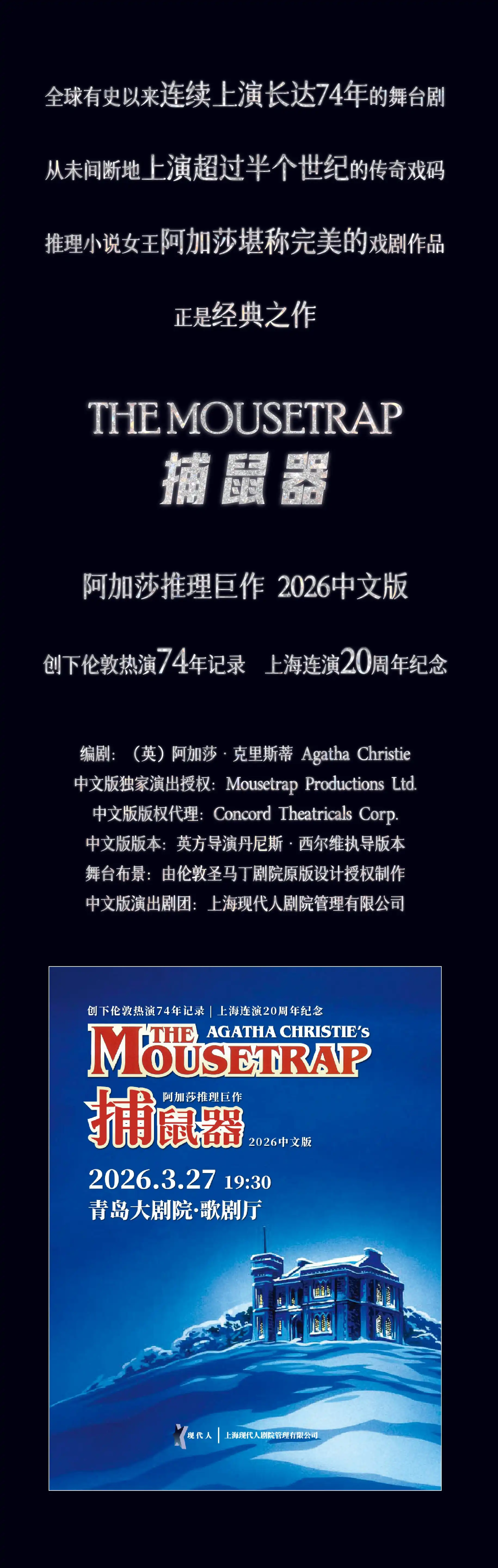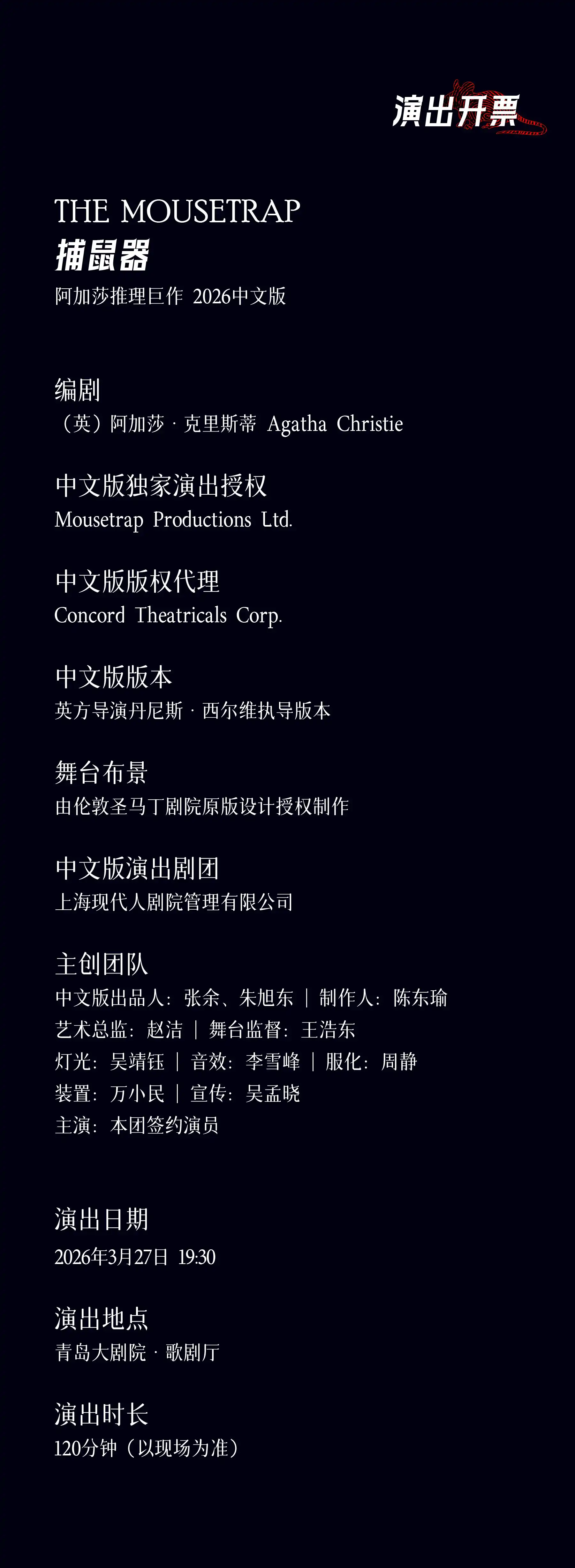 2026话剧《捕鼠器》青岛站将于2026年3月27日在青岛大剧院上演,下面小编为大家详细介绍一下具体的话剧《捕鼠器》青岛站门票价格、时间、地点及演出详情。