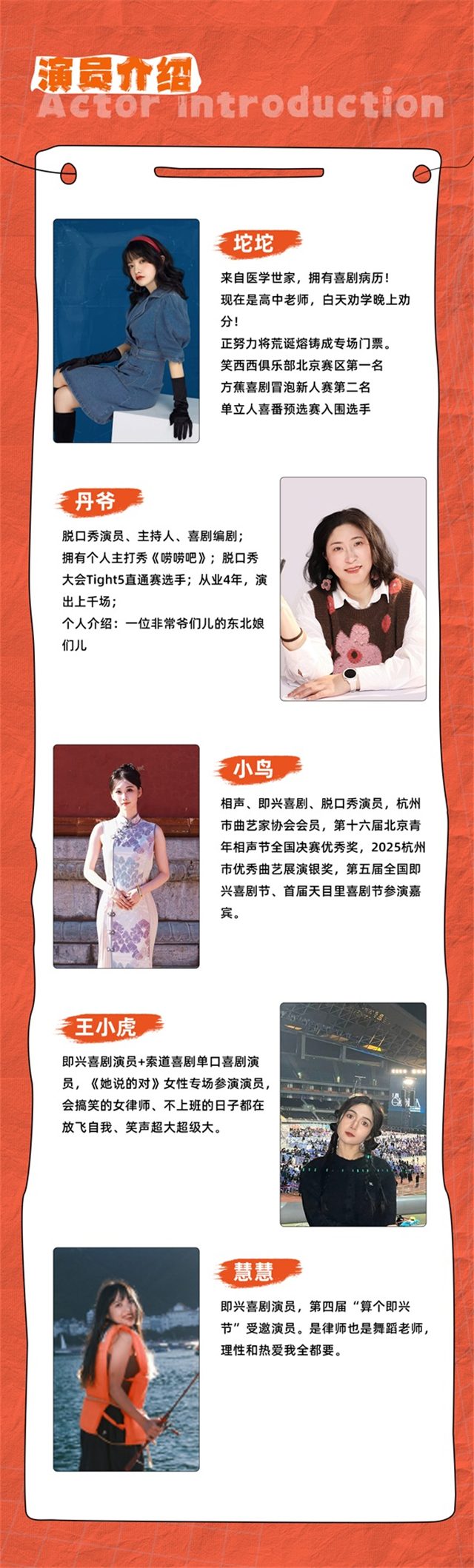 本场演出的演员全都是身怀绝技成熟演员,有在披荆斩棘的,有在专场好评如潮的,还有线下人气潜力星,总之都是搞笑新星。说不定就会在综艺里见到他们了,抓紧先来认识一下。