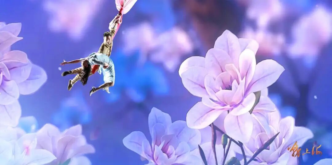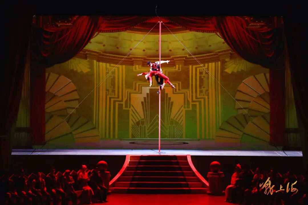 在“雨夜飞渡”篇章,主创以苏州河畔木桩为灵感设计梅花桩道具,演员在桩上攀爬、跳跃,完美还原突击队飞渡苏州河的惊险瞬间;“青春誓约” 中,双人绸吊与多媒体技术结合,将江华与白兰的真挚爱情唯美呈现。惊心动魄的特技展示,搭配真挚细腻的情感表达,让杂技不再只是技巧的展示,更成为推动剧情、传递情感的核心载体。