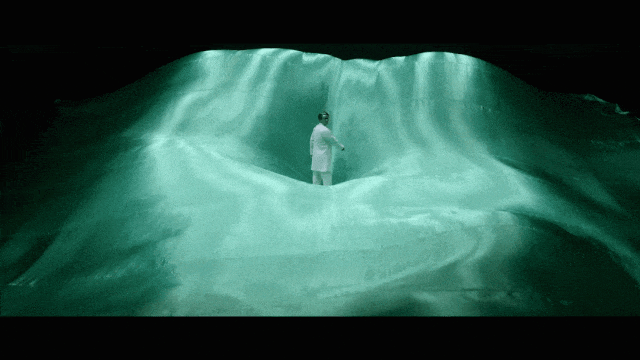 光影中粼粼闪烁的缎布下,先生立于其中,暮然回首,好像在回望自己的一生,又像在望向你我。