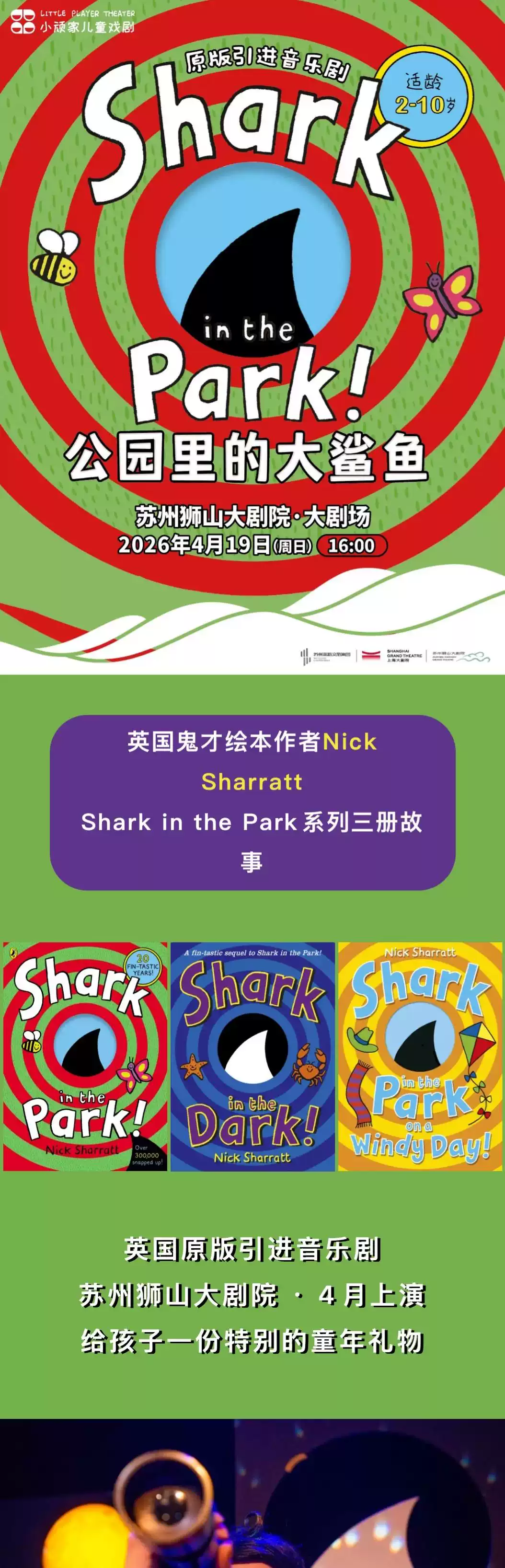 2026音乐剧《公园里的大鲨鱼》上海站将于2026年4月18日在上海大剧院中剧场上演,下面小编为大家详细介绍一下具体的音乐剧《公园里的大鲨鱼》上海站门票价格、时间、地点及演出详情。