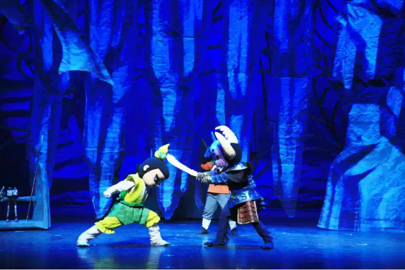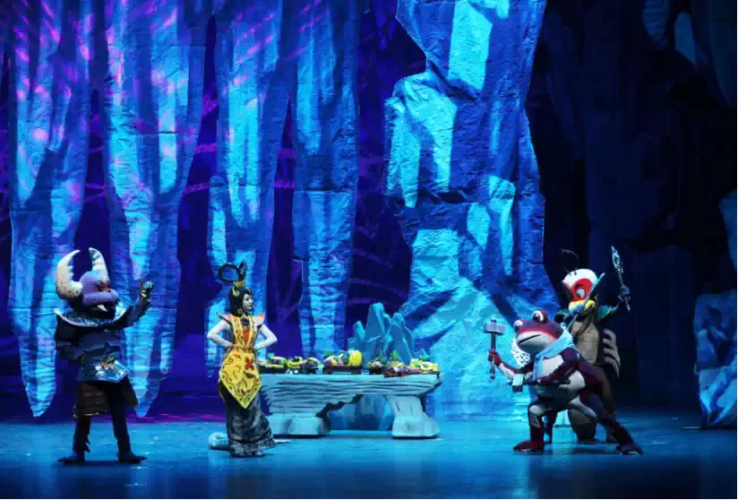 多媒体特效和实景道具相结合,原动画画面和舞台表演相呼应,更有立体感。