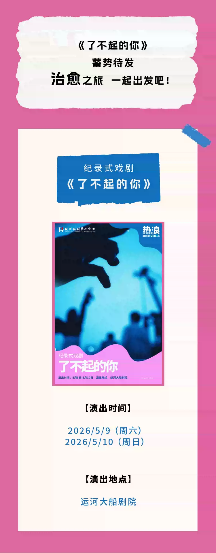 二零二六年五月九日至十日,运河大船剧院等你。夜晚七点半,灯光亮起,故事正式开始。