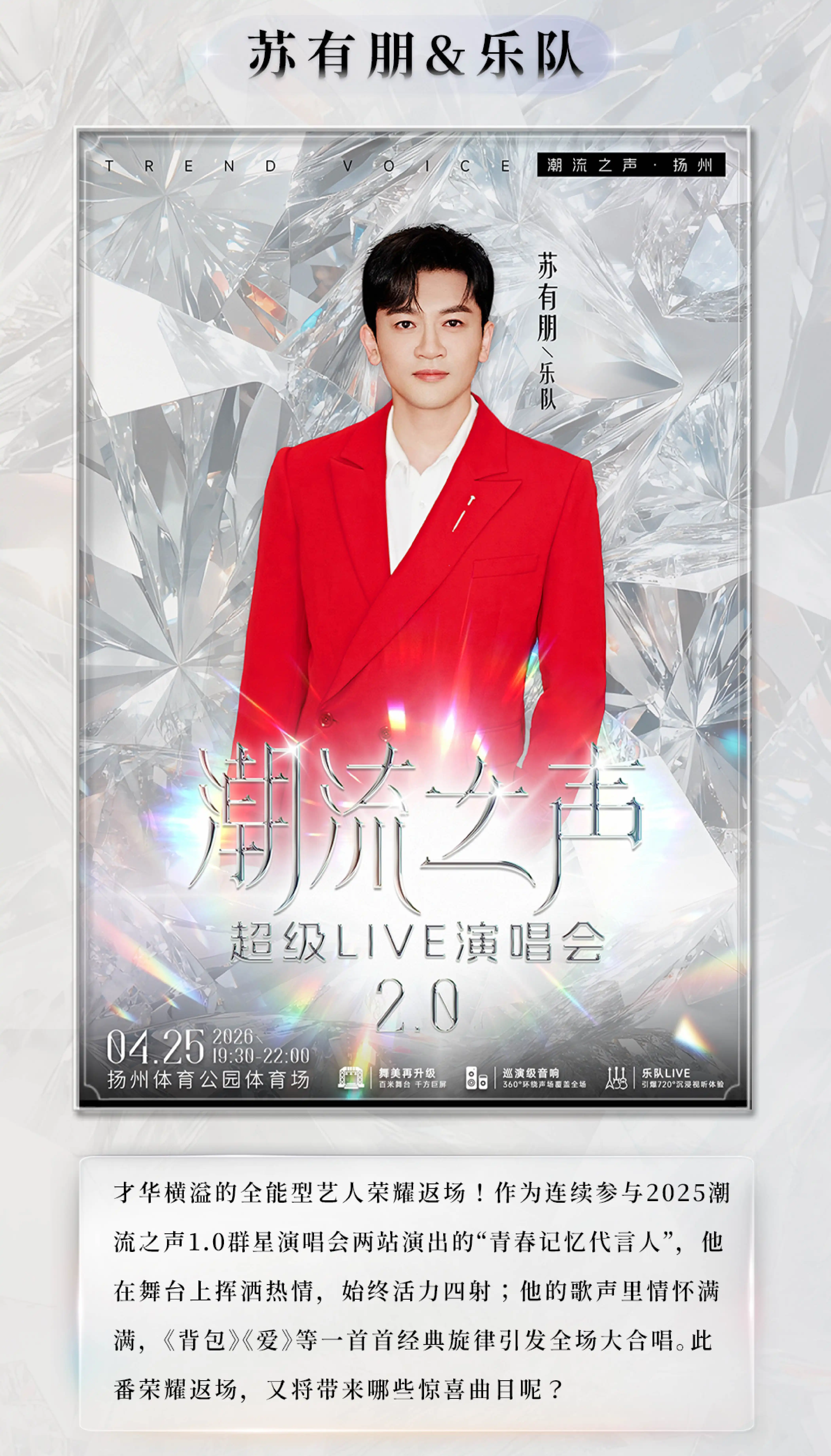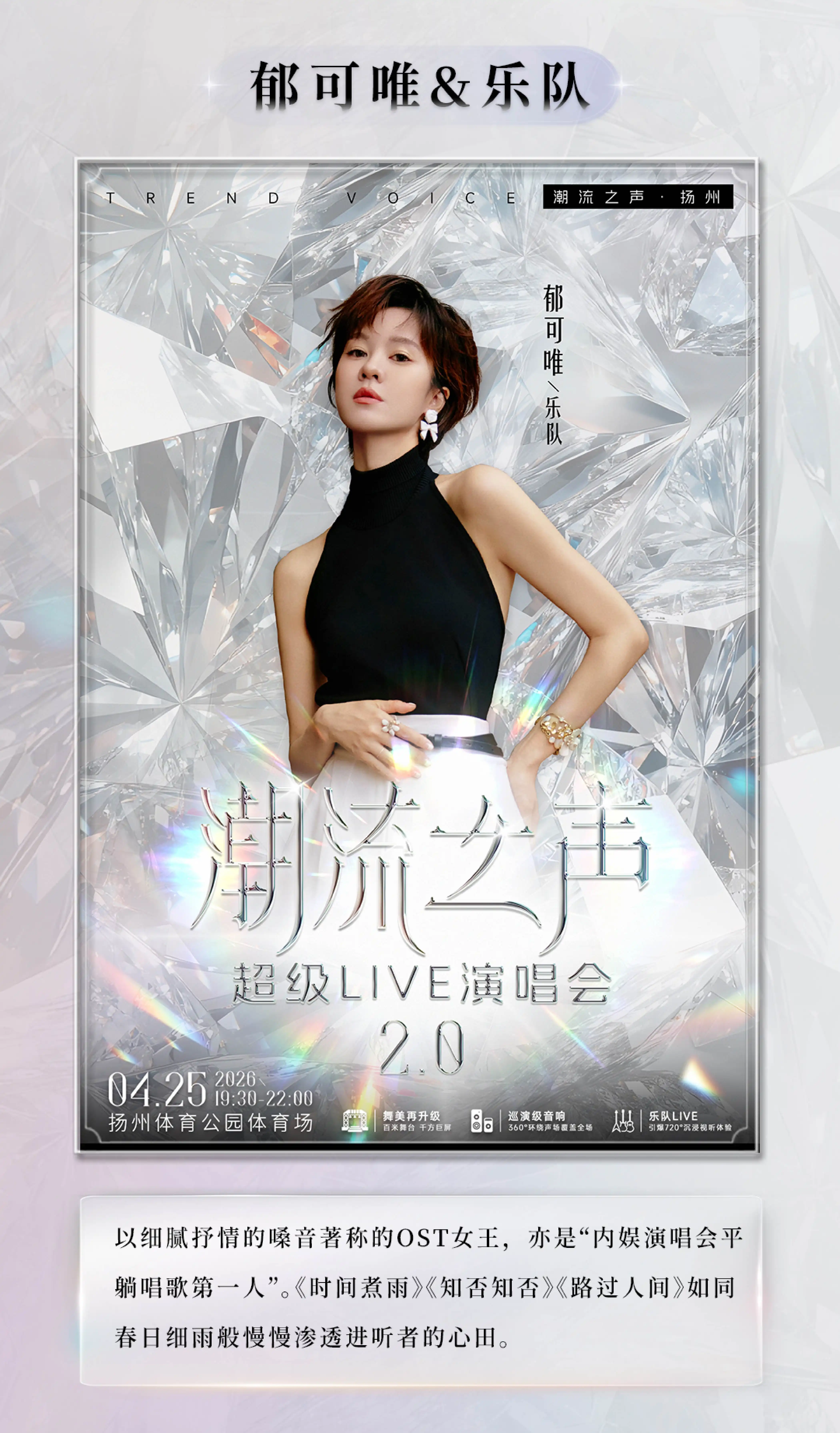 春风十里不如现场有你,扬州潮流之声超级 LIVE 演唱会即将开启。2026 年 4 月 25 日 19:30,锁定扬州市体育公园体育馆。