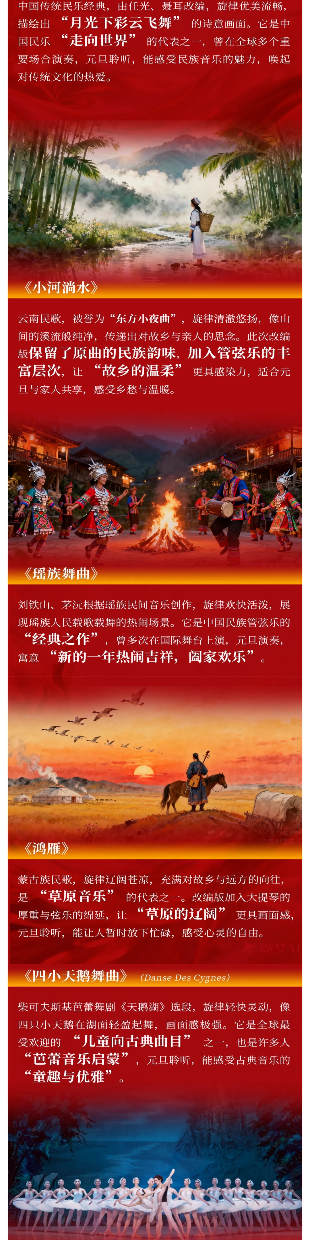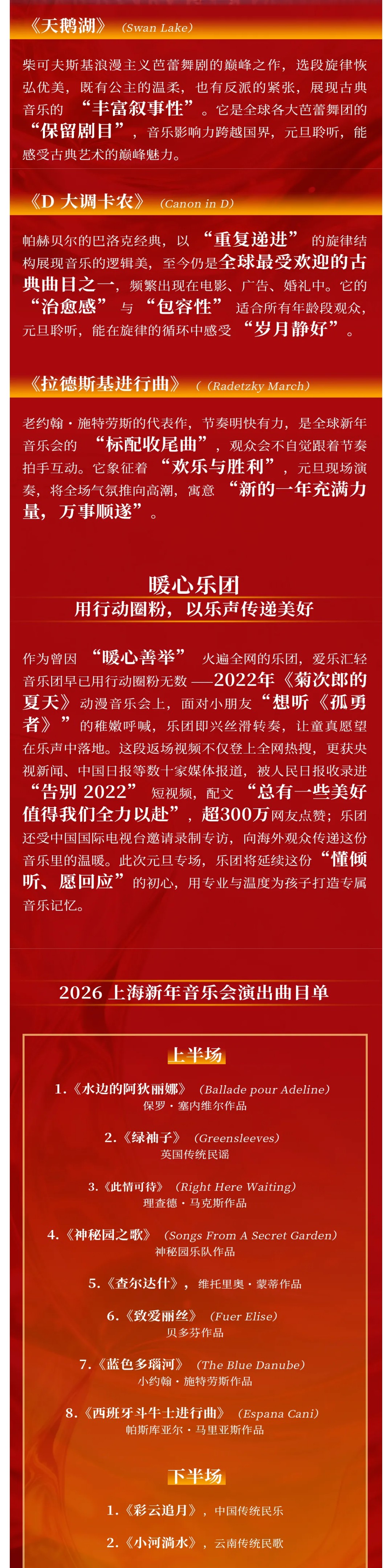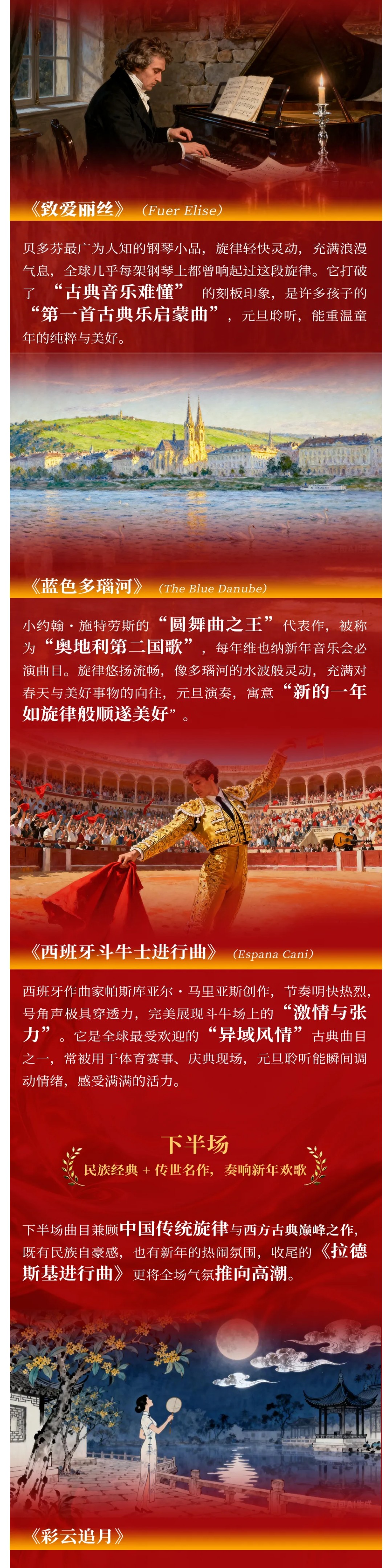 本场音乐会,将让中国观众不出国门就能欣赏到全世界的经典名曲。除了威风,欢快的《拉德斯基进行曲》,还有令人难忘的《卡门》组曲;雄伟,豪迈,令人骄傲沸腾的《红色娘子军》、《红旗颂》;被称为称为奥地利第二国歌的《蓝色多瑙河》;勃拉姆斯最广为世人所知的《匈牙利舞曲第五号》;源自古老的英国民歌的《斯卡布罗集市》等等一系列音乐,让喜欢音乐的人能够更近距离的感受经典曲目的美妙。