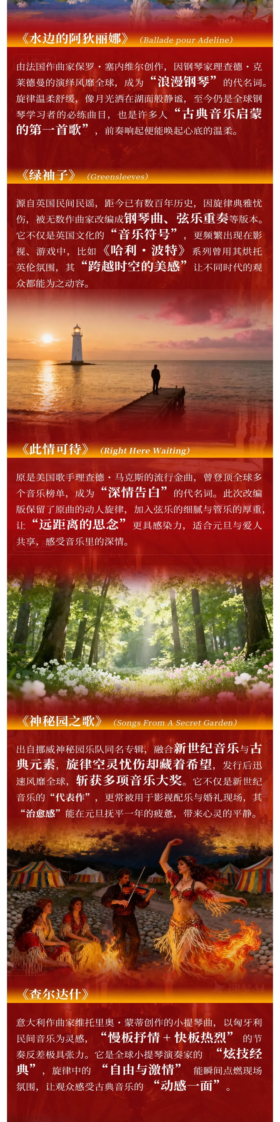 激情澎湃的艺术殿堂、专业演奏家对经典音乐的诠释、昂扬的音乐魔力、铿锵有力的旋律和那深入身心的节奏、都将给你带来一场无语伦比的体验!