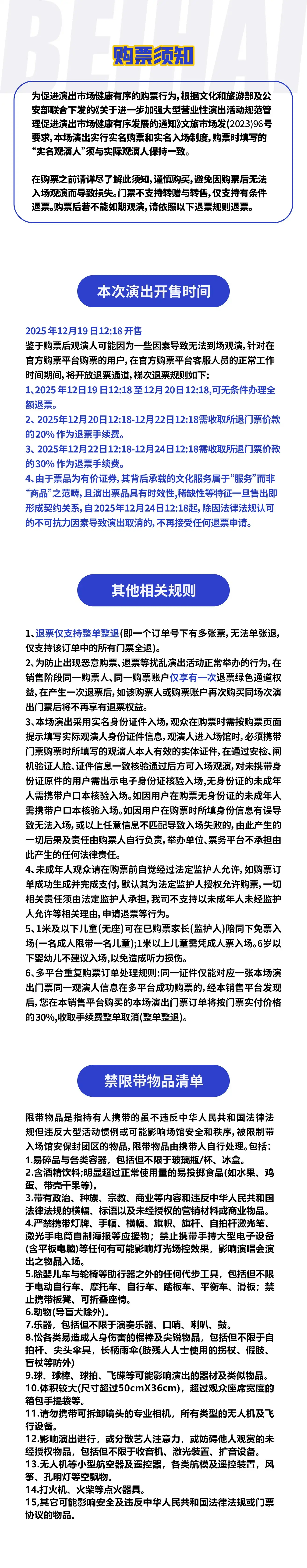 1.购买前请您提前规划好行程,做好相应准备,以免影响您的正常观演,感谢您的理解和配合。