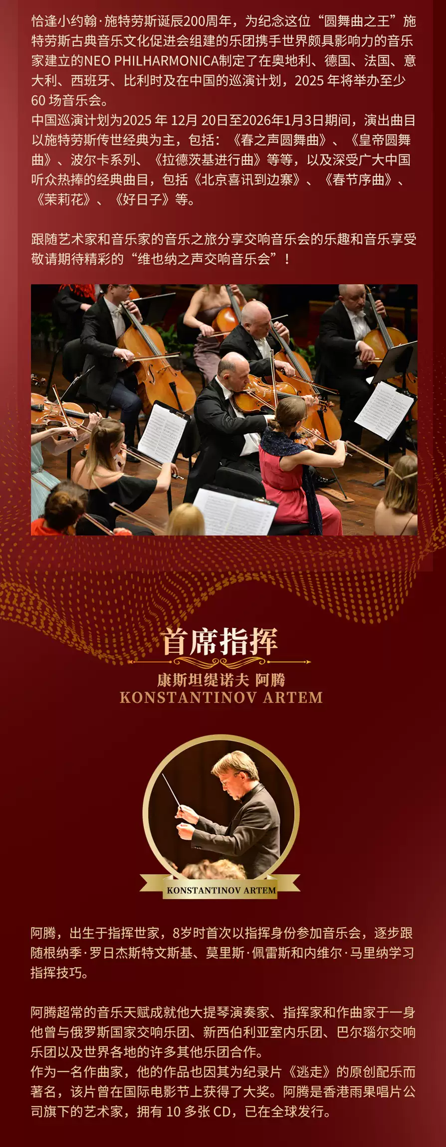 奥地利维也纳古典交响乐团成长并盛放于这片沃土,70余位音乐家传承经典,他们奏出的曲目音色纯正,音乐风格古朴凝练,每年30余场巡演世界的音乐之旅,让世界各地的人们见证了古典音乐的不朽魅力。