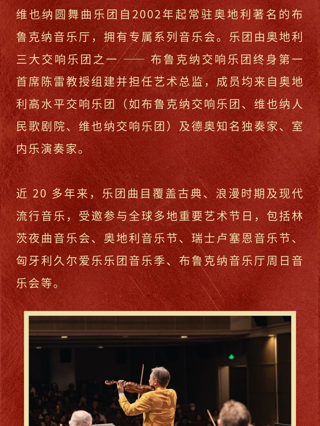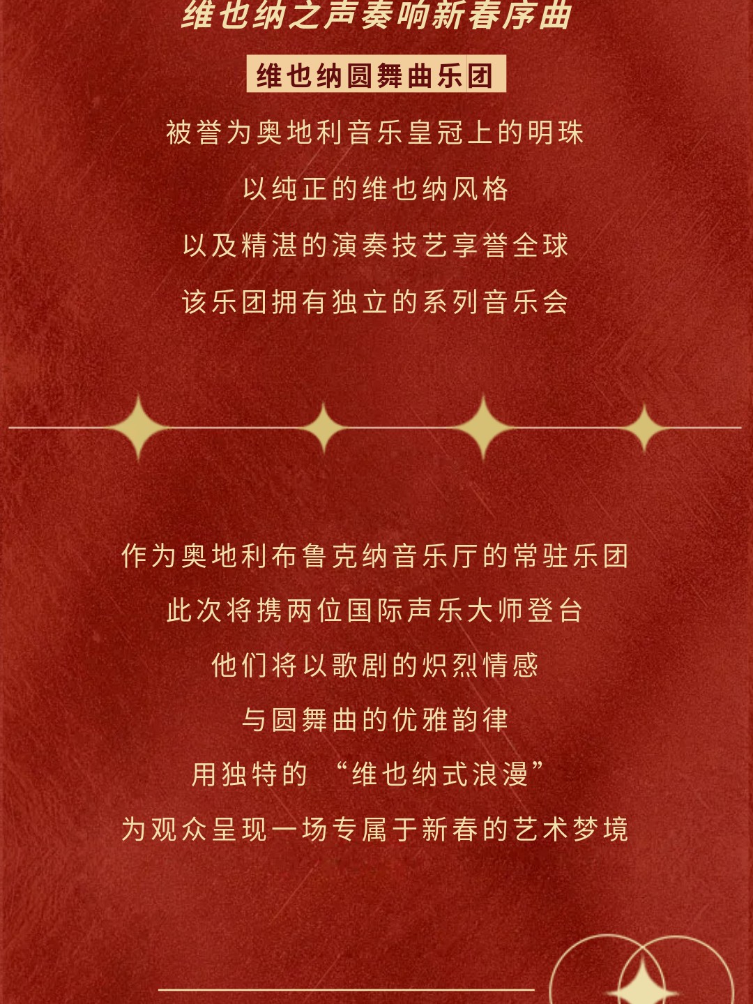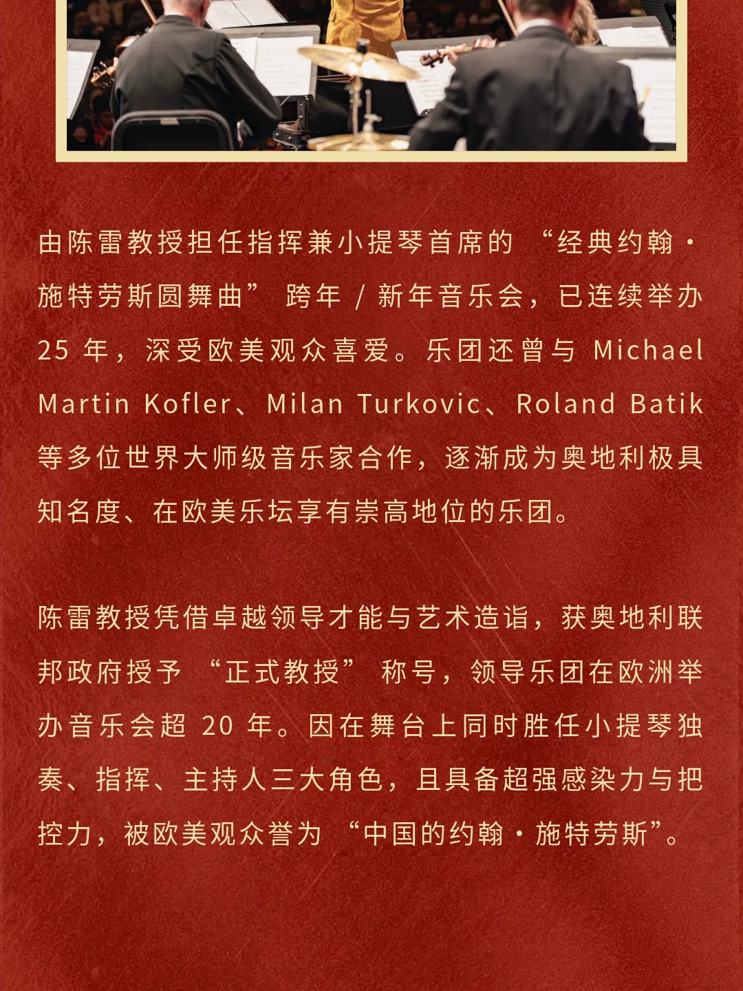 施特劳斯家族是十九世纪奥地利维也纳有名的音乐世家,主要指约翰·施特劳斯父子,即父亲老约翰·施特劳斯(1804-1849)和他的三个儿子――小约翰·施特劳斯(1825-1899),约瑟夫·施特劳斯(1827-1870)和爱德华·施特劳斯(1835-1916)。一直以来,施特劳斯家族的音乐,“承包”了世界各地许多国家的新年音乐会,时至今日,每年一度的维也纳新年音乐会仍是世界最引人注目的年度音乐盛会,演出的曲目是被称为“圆舞曲之王”的小约翰·施特劳斯及其家族的音乐作品,本场音乐会将重温这些在新年音乐会中让人难以忘记的经典名曲,展示的是人类最文明、最欢快、最明亮的一面,而高雅、轻松、豪华、热烈是本场音乐会的最大特点。由著名指挥执棒,带领乐团让中国观众不出国门就能欣赏的维也纳施特劳斯家族经典作品。