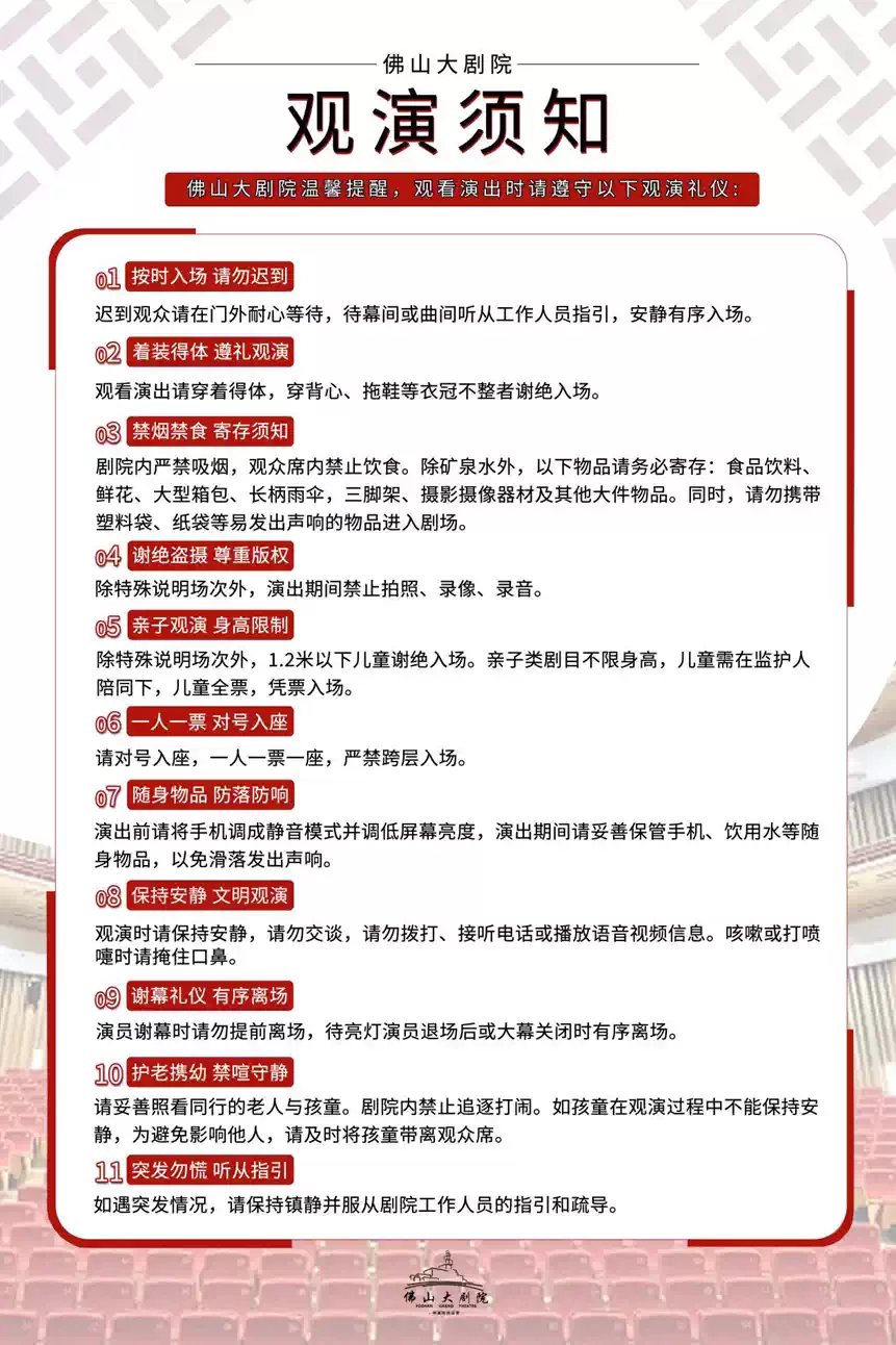 3.迟到观众需在场外等候,听从工作人员安排进场。请您合理安排出行时间,尽量提前抵达剧院,以免延误观演。