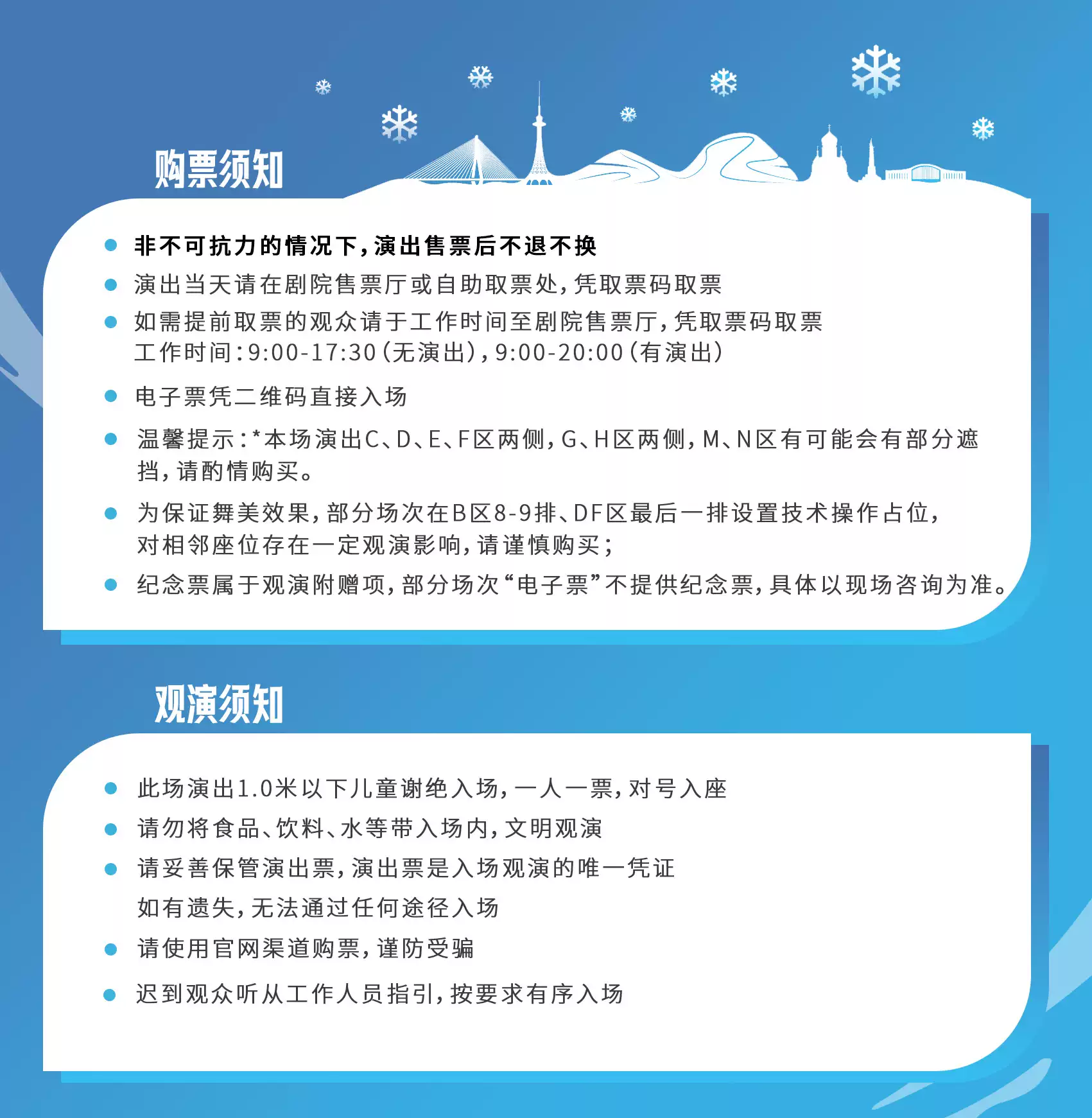 4.入场后,请严格按照票面指定区域和座位对号入座,请勿在演出期间换座,文明观演。