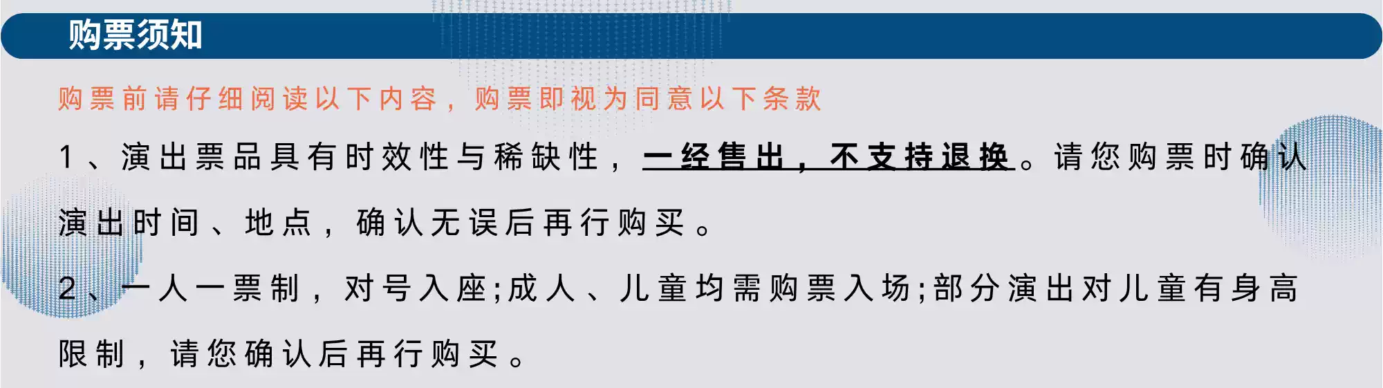 1.购买前请您提前规划好行程,做好相应准备,以免影响您的正常观演,感谢您的理解和配合。