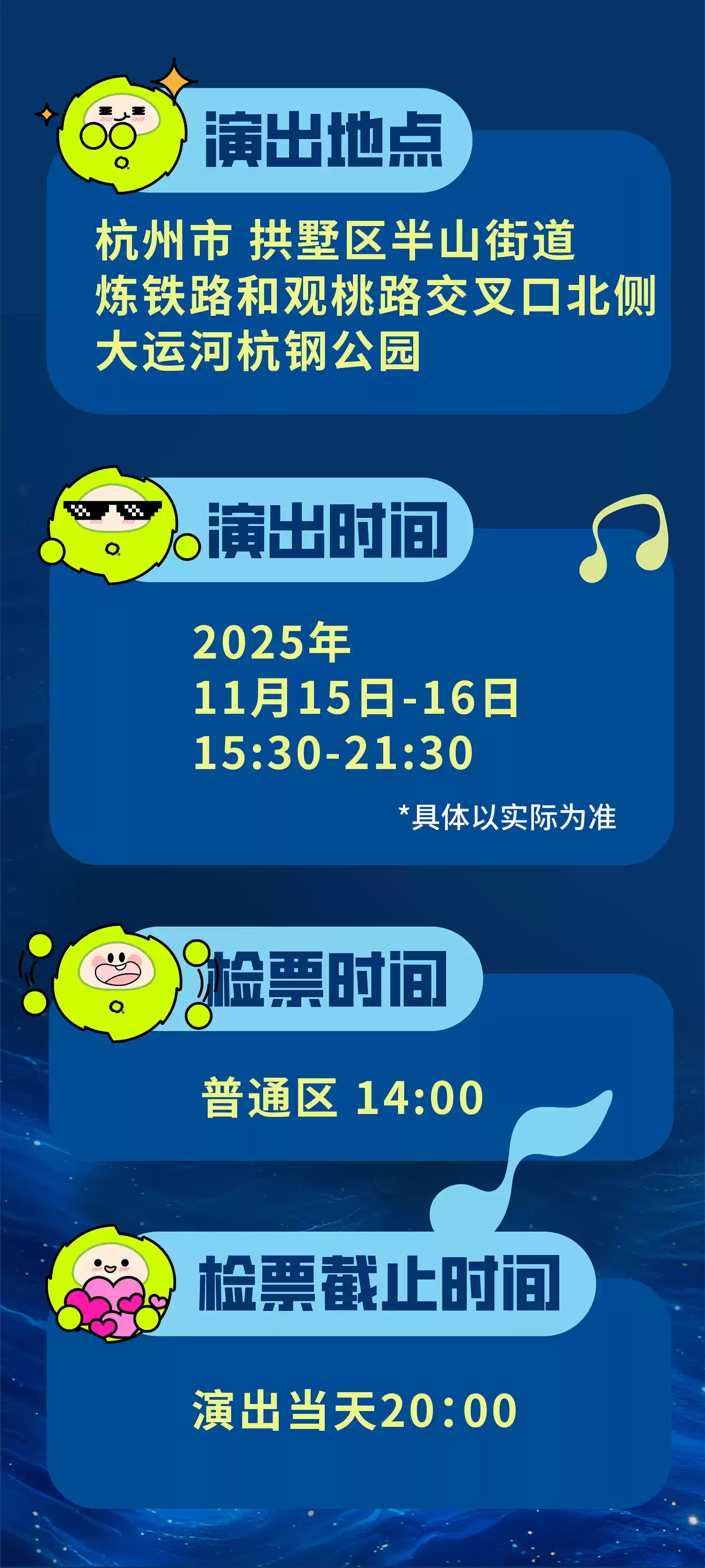 演出时间 2025.11.15-11.16 演出场馆 大运河杭钢公园 演出时长 以现场为准 儿童入场提示 儿童一律凭成人票入场 演出详情