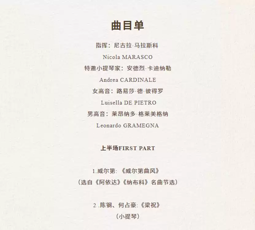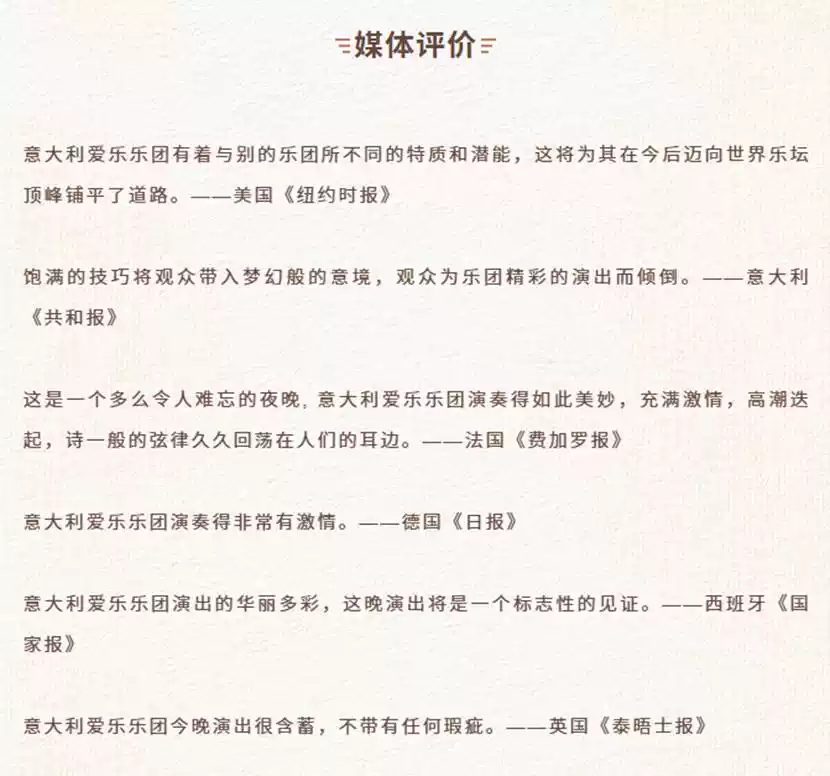 本场音乐会由意大利爱乐乐团携手多位艺术家同台出演,用精妙绝伦的技艺征服全场观众,为观众献上一场至臻多彩的音乐旅程。