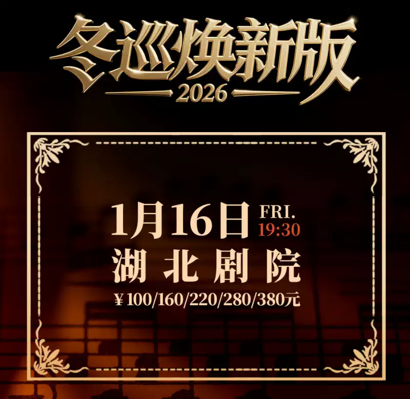 演出时间 2026-01-16 星期五 19:30 演出场馆 湖北剧院 演出时长 以现场为准 儿童入场提示 1米以上凭成人票入场,1米以下谢绝入场。 演出详情