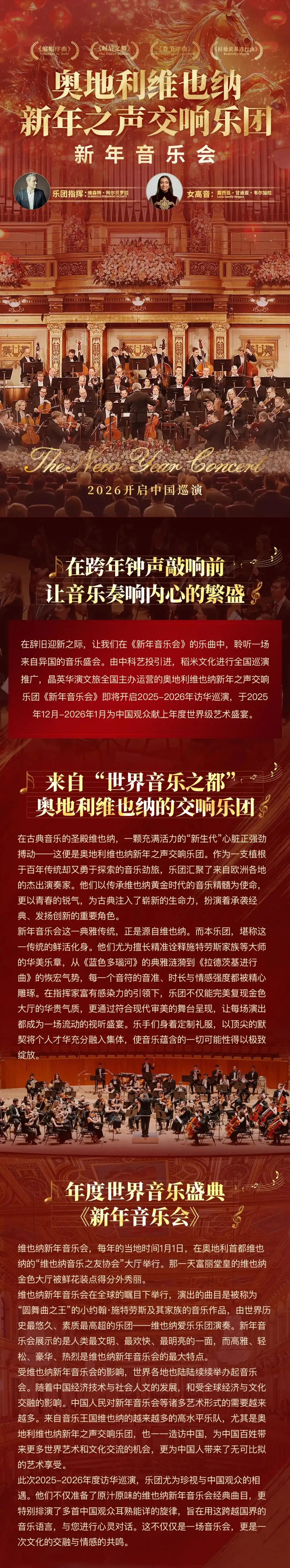 每年新年的第一天1月1日,举世瞩目的维也纳新年音乐会都会在维也纳金色大厅如期举行,成为新年不可或缺的庆典。12月21日在深圳音乐厅,维也纳古典交响乐团邀您聆听一场高水准的新年音乐会,在《春节序曲》中打开新一年的美好与幸福。