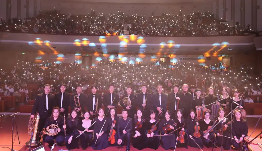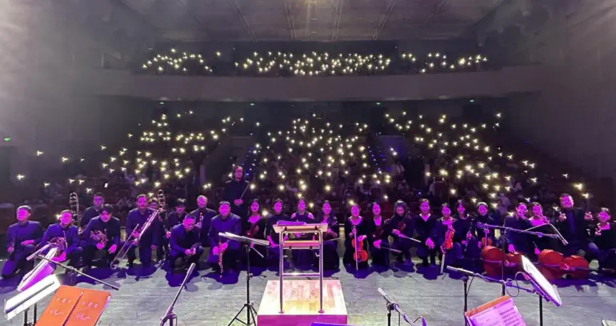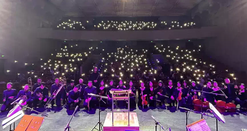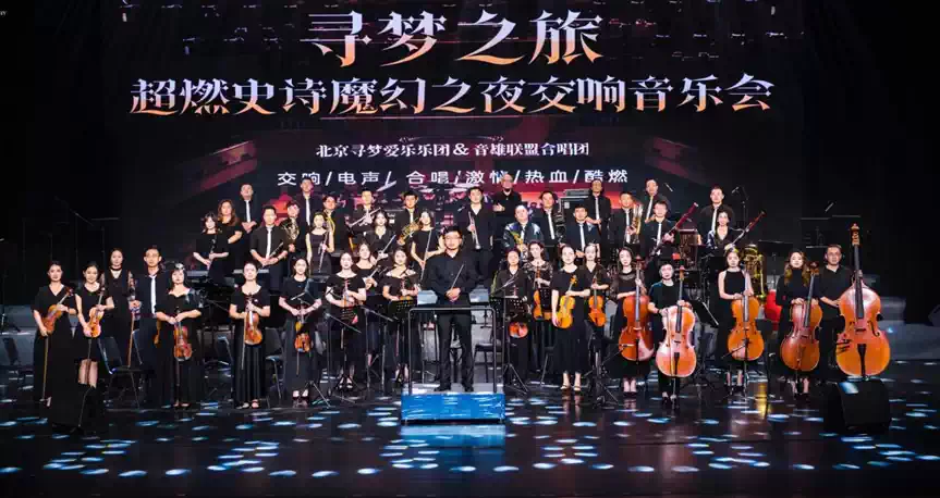 本场演出乐团是一支集古典与时尚于一身的音乐新势力—北京寻梦爱乐乐团。他们既保留了古典的风格,又融合了当下的流行元素。通过电子合成器、民乐乐器与管弦乐队混合的编制,结合现代作曲、编曲和高科技的表现手法,使其演奏不仅具有大型交响乐团的震撼效果,更是将每种乐器演奏的音符展现的沁人心脾,给人前所未有的新奇潮流体验。