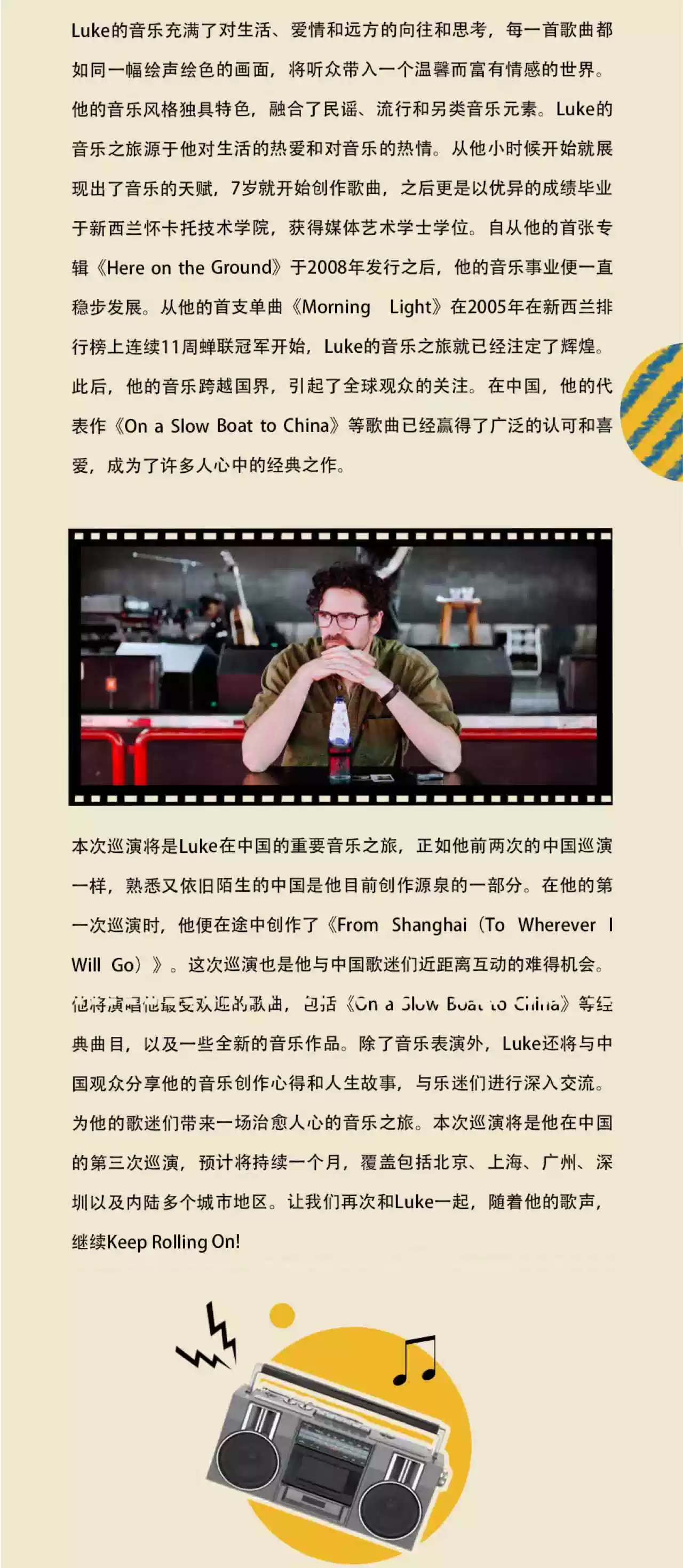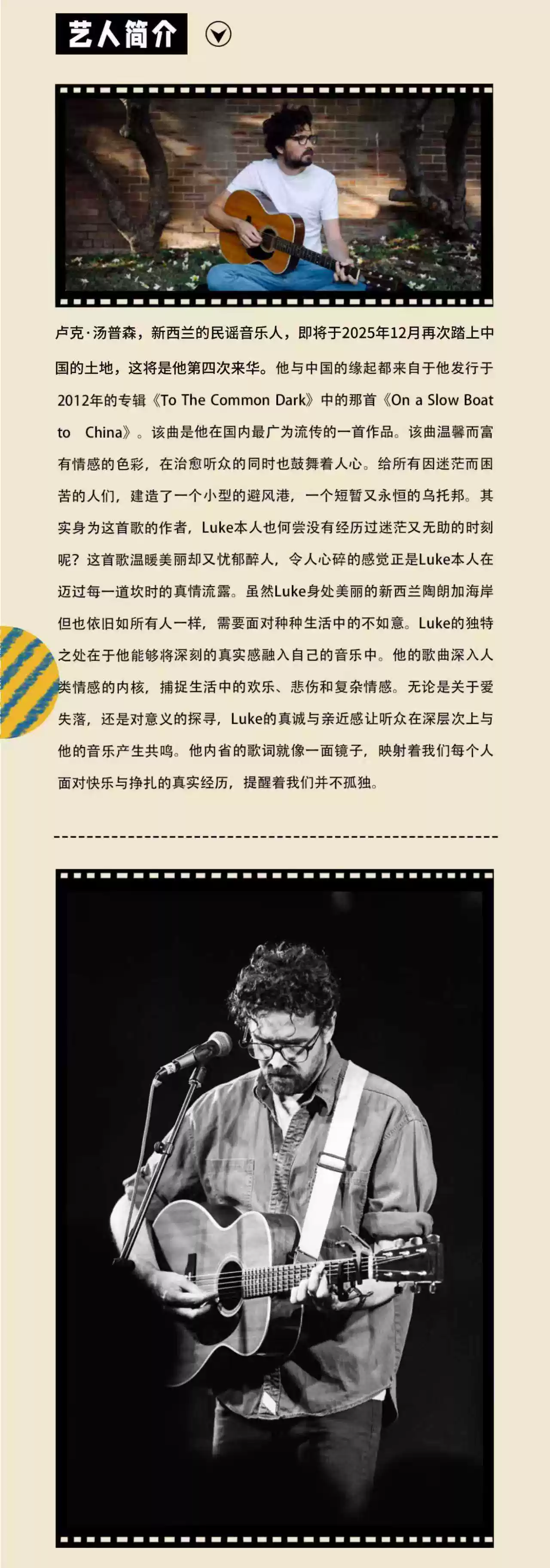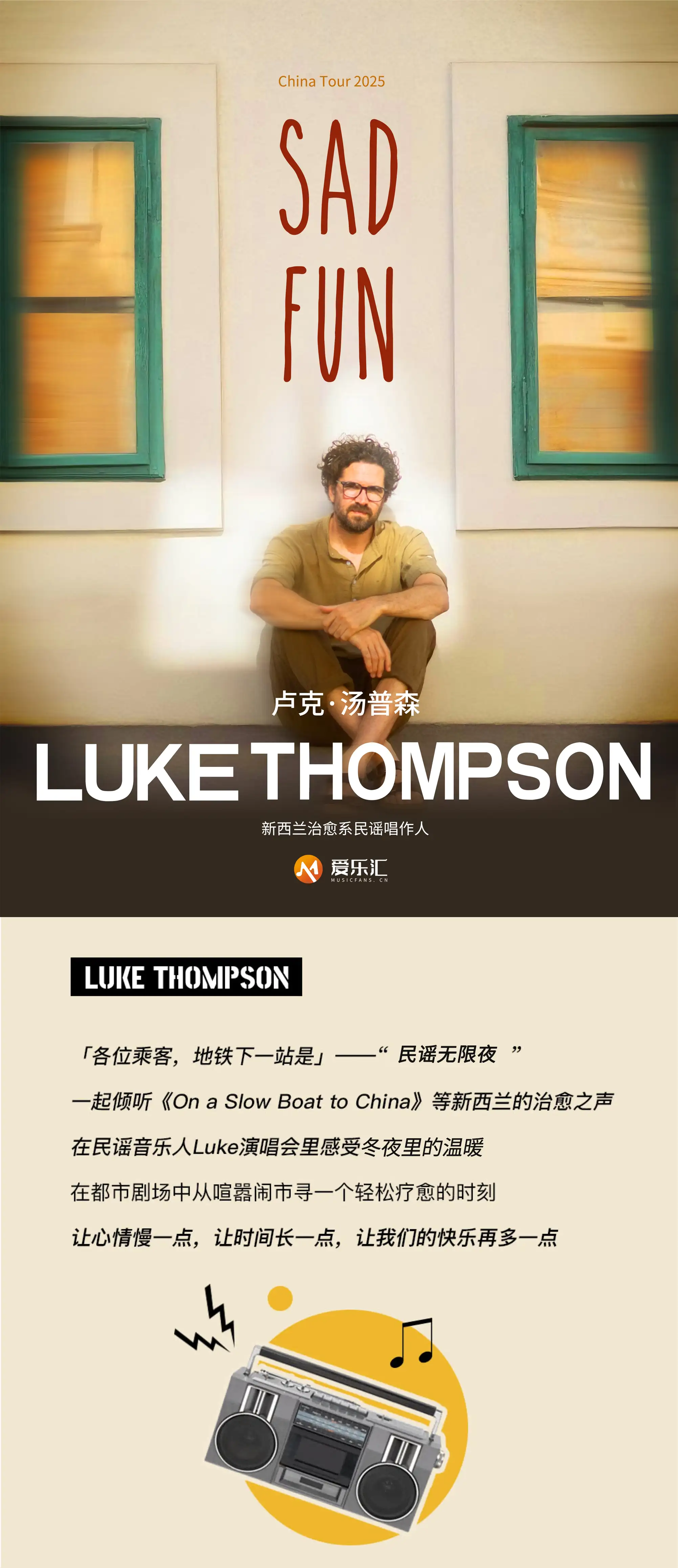 从他的那首《On a Slow Boat to China》开始,他便与中国正式结缘,时隔多年,他的慢船终于到达中国,稚嫩的他变得不修边幅,他的音乐也更加迷人,更具魅力。如果你是一个民谣迷,如果你想感受诗一般的音乐,12月15日,Luke Thompson2019巡回演唱会-北京站,千万不可错过!