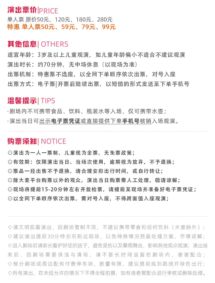 ⊙演出为一人一票制,儿童视为全票,无免票政策;⊙有效期:仅限演出当日、当场次使用,逾期视为放弃,不予退换;