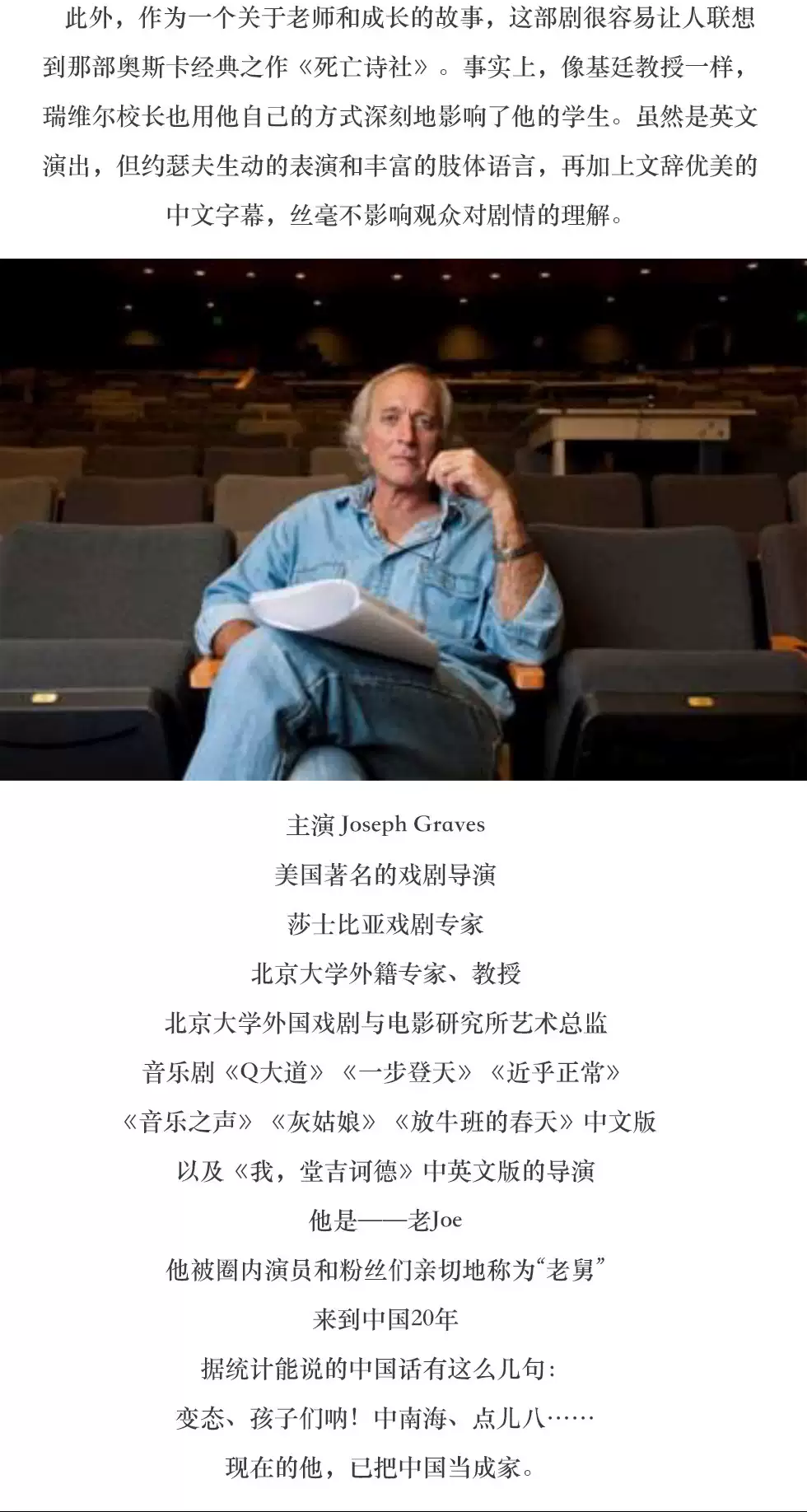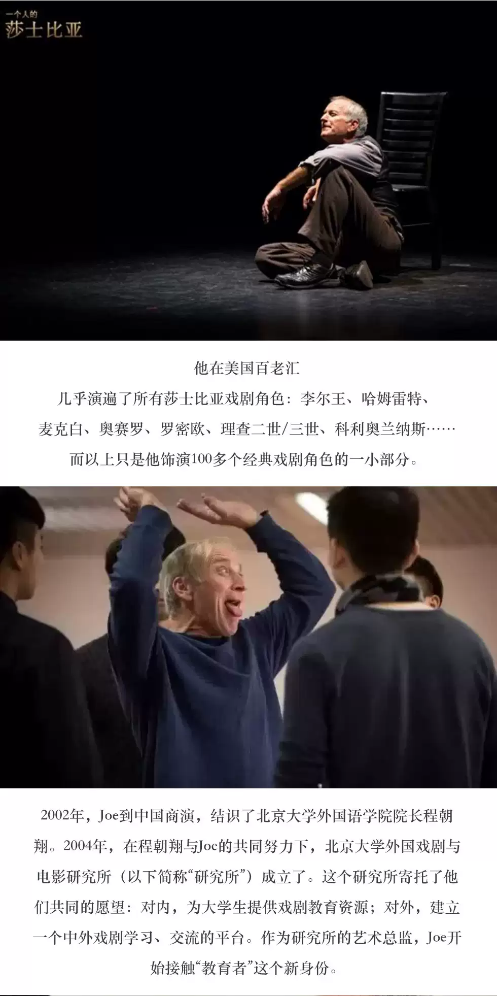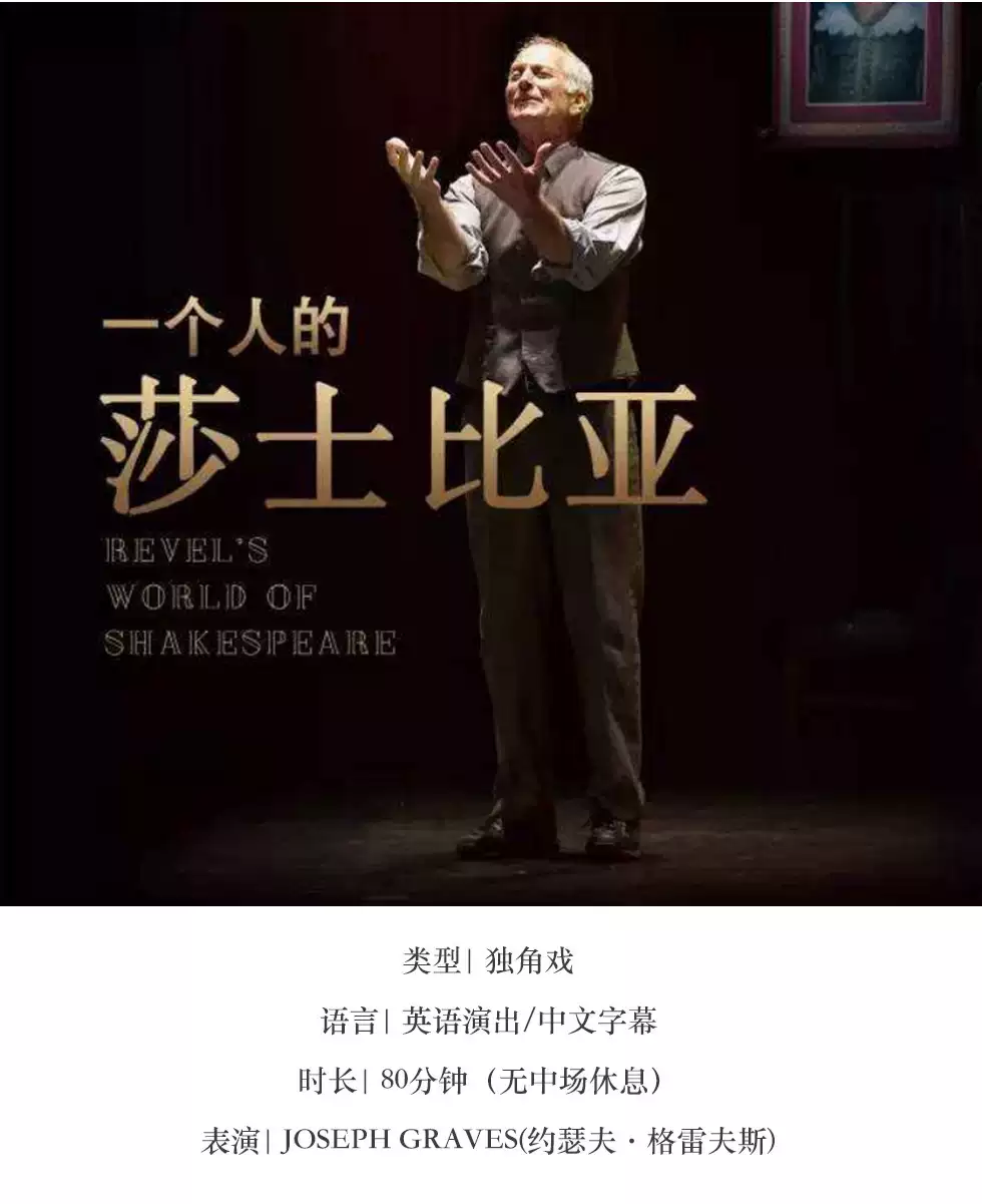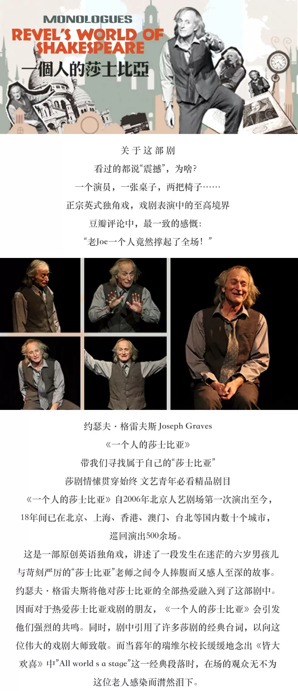 原创英文独角戏《一个人的莎士比亚》2006年在北京人艺剧院进行了首演,距今已有13年的时光,老戏骨约瑟夫的脸庞也增加了越来越多的岁月痕迹,在这13年里,这部戏走遍了中国北京、上海、香港、澳门、台北等数十个城市,总演出超过300场,每一场都人满为患,每一场都好评如潮。