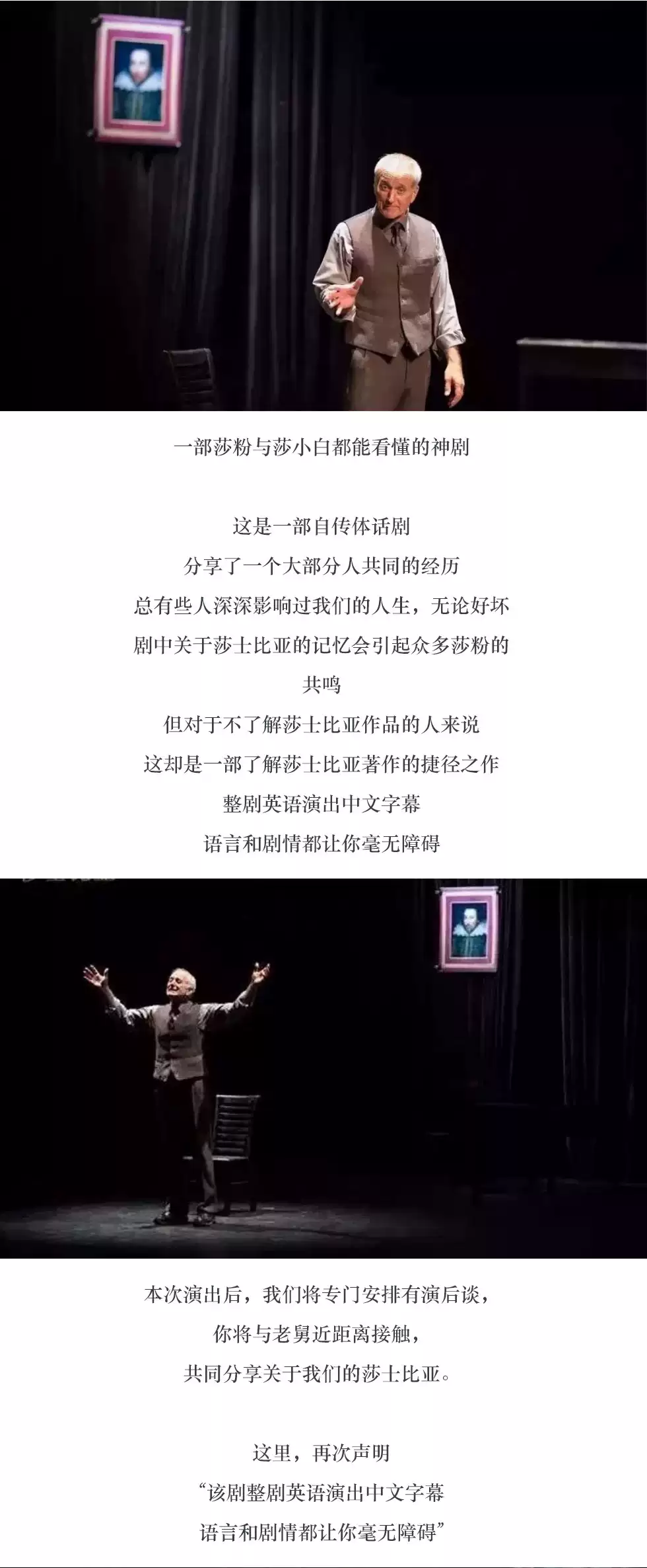 《一个人的莎士比亚》虽然是一部一个人的“独角戏”但是却丝毫没有“舞台空空”的单一感,在老戏骨约瑟夫的生动表演和丰富的肢体演绎下,让你有一种时空穿梭,仿佛一场跨越时代的对话呈现在你的面前,即便是英文演出,也丝毫不影响观众对剧情的理解与思考,当然,是有中文字幕的哦!