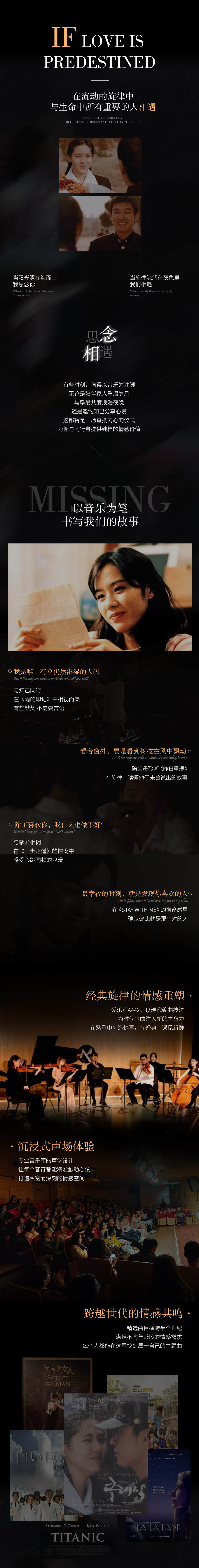 “More Than Love”假如爱有天意 —— 浪漫经典名曲音乐会,带你走进有关爱情的音乐世界,在悠扬美妙的旋律之中,找寻属于彼此的美好记忆,本场音乐会,精心选择了13首乐曲,有经典爱情电影的主题曲或插曲,带领大家度过一个浪漫而动人的情人节之夜