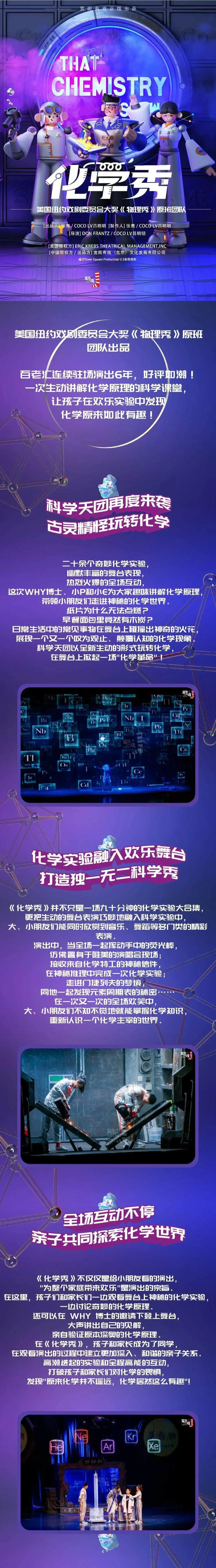 2019年,由《物理秀》中文版原班团队打造的《化学秀》,登陆即将中国,掀开一场儿童戏剧舞台上的“化学革命”。一直到2021年,化学秀已经成为儿童剧中的口碑栏目,奇幻瑰丽的物质变化,引起孩子探索化学世界的向往,日常生活中所处可见的化学变化,让孩子发现化学就在自己的身边。