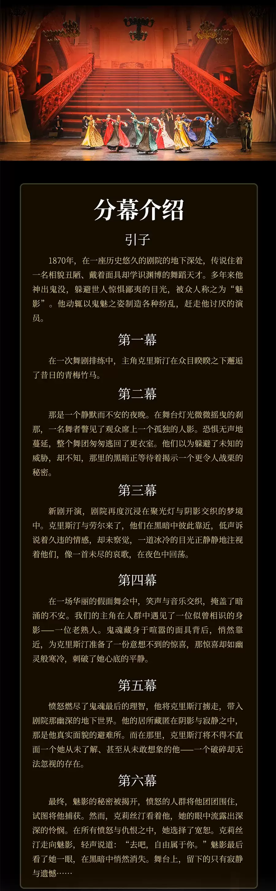 让观众在真实流露的情感中意犹未尽,为了更好的保证舞剧水准,改编自音乐剧版的《剧院魅影》由创始人指导完成,并在2001年首演至今赴世界各地演出收获好评。