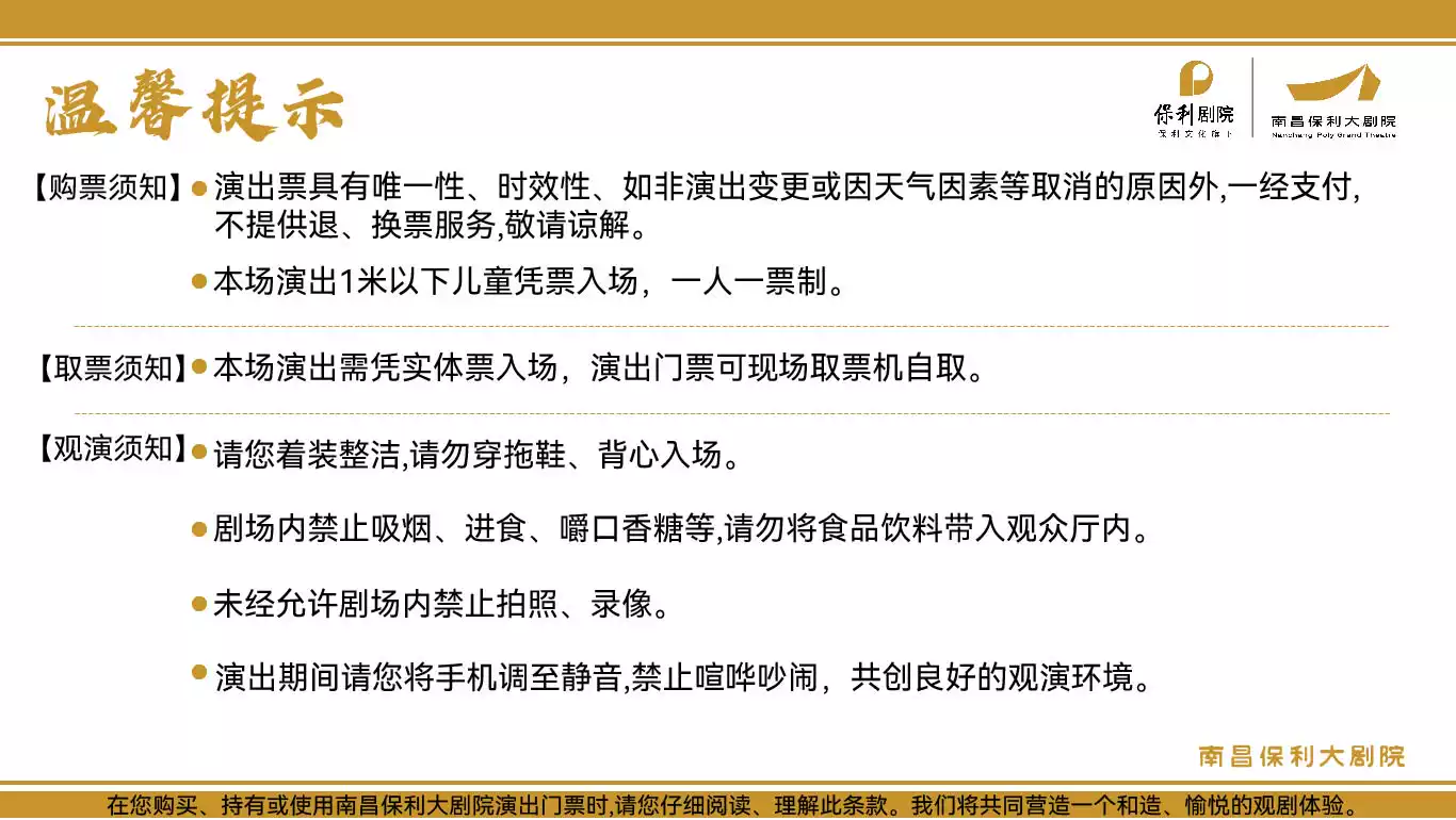 3.迟到观众需在场外等候,听从工作人员安排进场。请您合理安排出行时间,尽量提前抵达剧院,以免延误观演。