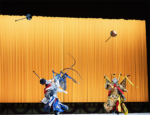 本次演出的《四平山》是张翼鹏先生版本,由张善麟老师教授,是一出可看性非常强的勾脸武生、花脸两门抱的靠把戏。在这出戏中,李元霸和裴元庆二人都使用双锤,都有很多高难度“耍锤”技巧。李元霸唱“粉蝶儿”“石榴花”“上小楼”等曲牌,且逢唱必耍,难度很高。南派独有的特色:双锤出手是一大看点,尤其两人有一套同时锤花出手的动作,更要求默契十足。