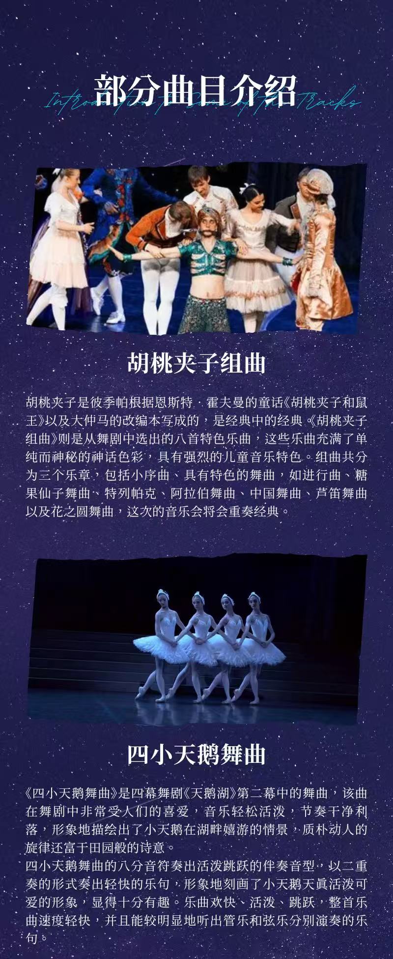 《胡桃夹子》是世界上公认的伟大的古典作品之一,有“圣诞芭蕾”的美誉。它的音乐充满了单纯而神秘的神话色彩,轻巧的乐律如仙子纤细的身影,愉快地音符编织出绮丽的华景,成为一百多年来,西方欢庆圣诞的传统乐章。