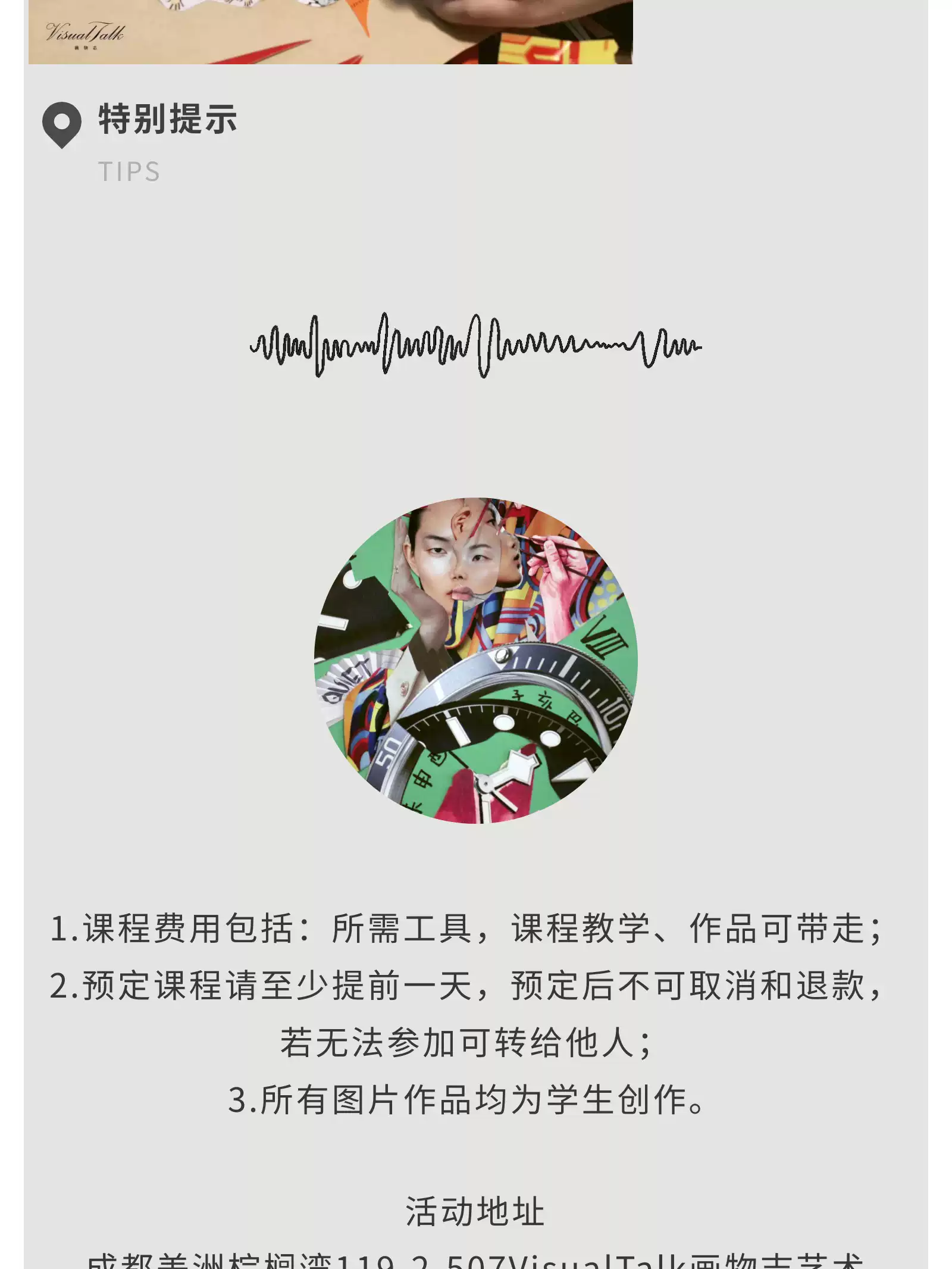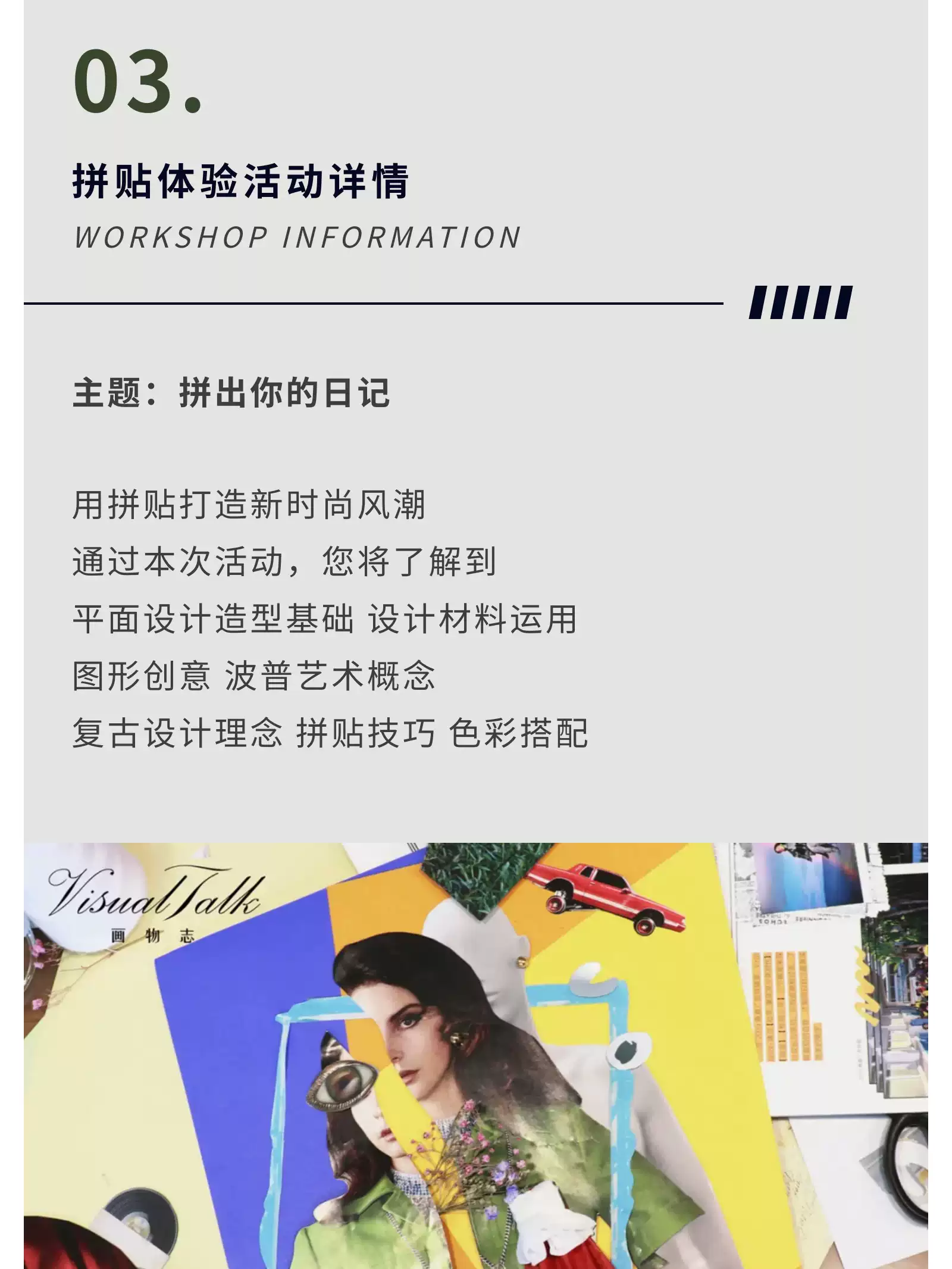 课程费用包含饮品,拼贴素材,工具,作品可带走,通过本次活动,大家将了解到平面设计造型基础、设计材料运用、图形创意、波普艺术概念、复古设计理念、拼贴技巧、色彩搭配等。