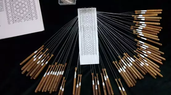 制作一个不太复杂棒槌蕾丝,需要把丝线绕在近几十只或上百只小梭上,根据图案采用不同的编、结、绕等手法来制作。可见每一件蕾丝作品都是如此的难能可贵。