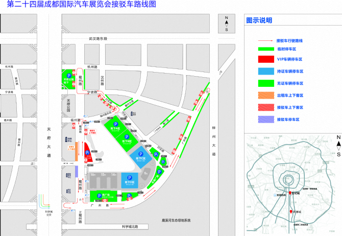 路线二(外场停车场-展馆入口处):10号馆(后门)---16号馆(后门)---西博城4号门(展馆入口处)路线,循环不间断摆渡。