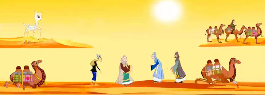 在荒无人烟的戈壁滩上,波斯商人的驼队从沙漠穿越到绿洲,因干渴多日,饮水时不慎坠河,九色鹿帮忙将落水人驮上石岸,只希望商人切勿将相遇一事外泄。商人到了古国皇宫,与国王谈起沙漠中的奇遇,谁知王后听闻,执意要取九色鹿的毛皮做衣裳,重金求购。商人见利忘义,向国王告密,并设计捉拿九色鹿。商人佯装再次落水,神鹿闻声赶来,守候的武士们准备万箭齐发,但王后担心射坏了它美丽的毛皮,计划火烧整片森林,九色鹿最终涅槃挽救苍生。