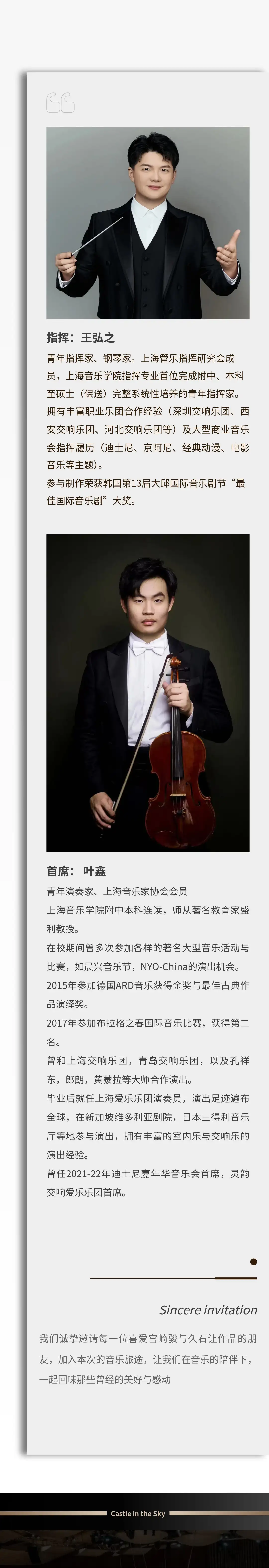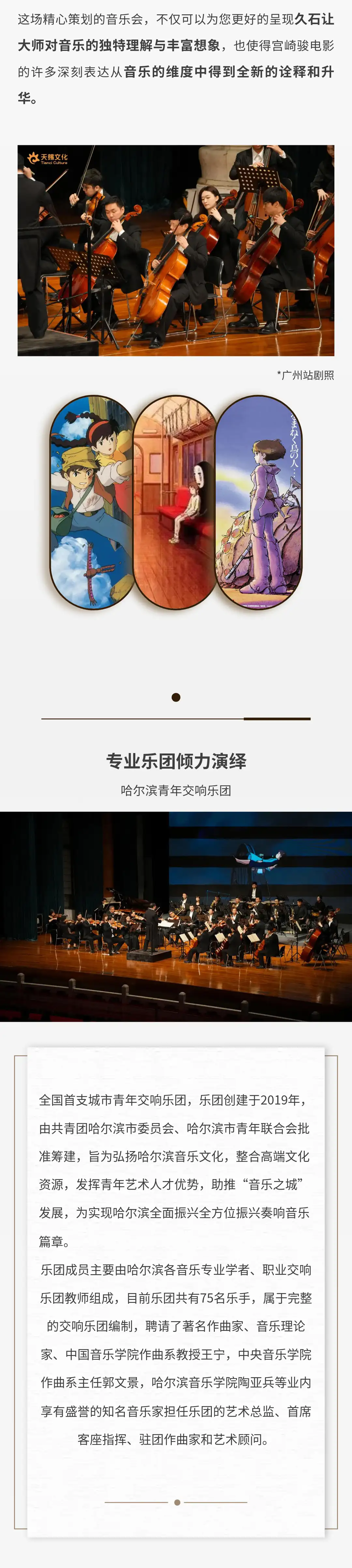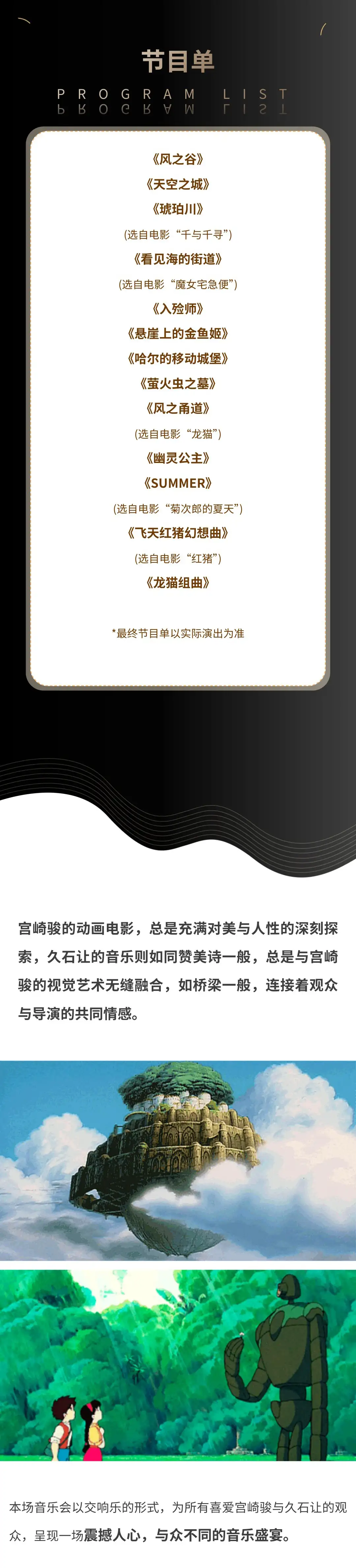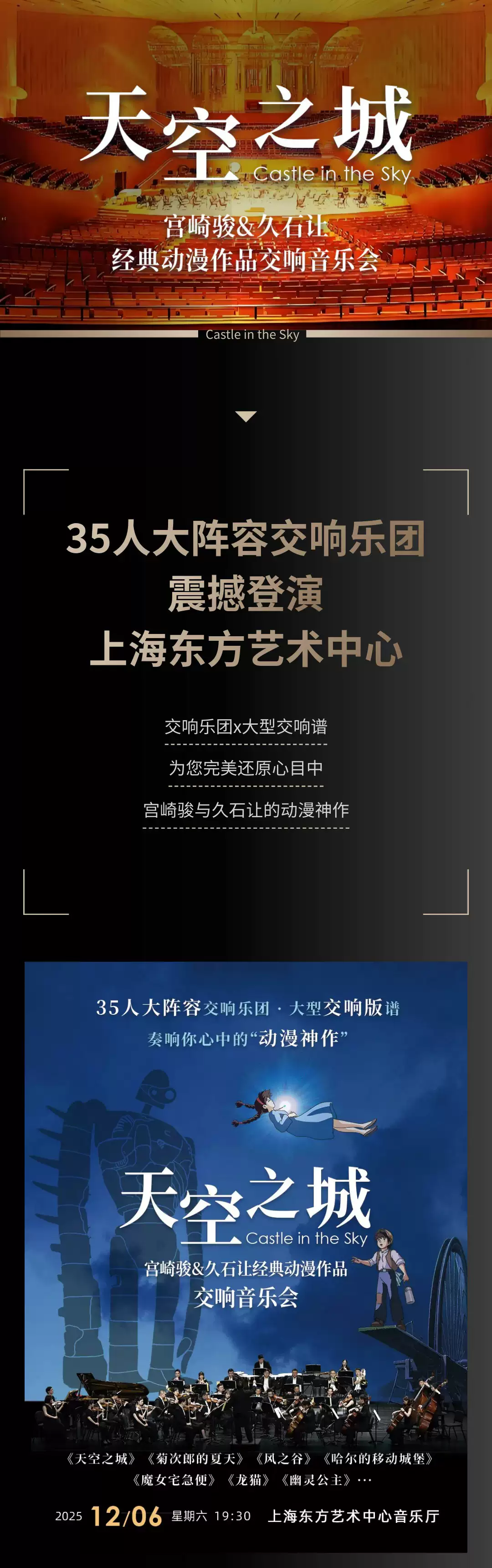基本信息演出时间 2025-12-06 周六 19:30 演出场馆 上海东方艺术中心音乐厅 演出时长 以现场为准 儿童入场提示 1.2米以上凭成人票入场,1.2米以下谢绝入场。 演出详情*请留意确认所购场次和票档,票品一经售出,恕不退换。      温馨提示:所有观众,无论年龄大小都必须持有“随申码”绿码以及72小时内(从采样时间起算)核酸检测阴性证明方可进入。仅持有24小时内核酸采样证明而无72小时内核酸检测阴性证明的观众将不能进入。若有72小时内核酸阴性证明但非在沪检测,可通过工作人员手工核验。请严格遵守凯迪拉克·上海音乐厅观众防疫须知 《天空之城》—久石让·宫崎骏动漫作品视听音乐会 这辈子,如果有幸遇见一个懂你的人,才不算白来这世上走一遭。 宫崎骏和久石让刚好就是那一对互相懂得的知己。  约一场经典的动漫音乐会 乘着纸飞行机, 从哈尔的移动城堡出发, 与千寻穿越过风之谷, 和魔女徜徉在神秘的天空之城, 带天真童趣的龙猫在旋转木马上放飞童梦……  自从1984年在《风之谷》里合作之后,两位老先生已经合作超过大半个世纪。每一次相遇,都能打造出无数经典。  △宫崎骏△ 奥斯卡金像获得者,世界知名的动画导演、动画师及漫画家。 创立了受到国际上广泛赞誉的动画工作室——吉卜力工作室,被《时代杂志》认为是世界上最具影响力的人物之一。  △久石让△ 世界著名的音乐作曲家之一,为动画电影《风之谷》、《千与千寻》、《悬崖上的金鱼姬》等创作配乐而闻名世界。至今为止,久石让已经在国内外为超过60部电影创作音乐,其乐迷遍布世界各地。 我不知道将去何方,但我已在路上。  ——宫崎骏《千与千寻》 生活坏到一定程度就会好起来,因为它无法更坏。努力过后,才知道许多事情,坚持坚持,就过来了。  ——宫崎骏《龙猫》 生命中最艰难的那段路是要自己一个人走过来的,这样,学到更多的是坚强,而不是感动。  ——宫崎骏《红猪》 当所有的音符,如七彩画笔勾勒出那些你爱的模样寻找童趣的旅行就开始了······经典:原汁原味的完美演绎 视听:动漫魅力音乐荟萃 新颖:高雅且通俗、最受观众喜爱的动漫音乐会  宫崎骏!他曾经让我们认识了 可爱直率的魔女琪琪 聪明勇敢的千寻 还有软萌有爱的龙猫君 ······ 演出乐团  Kalliope卡里欧室内乐团 被“人民日报”,“环球音乐”等知名媒体报道,“上海交响乐团Misa星推秀”获奖乐团,作为国内的新生代室内乐团,“卡里欧室内乐团”用爱与热情,重塑古典音乐的当代审美。 Kalliope卡里欧室内乐团成立于2013年,乐团之名源于希腊神话中诗歌女神化身‘Calliope’,由四位英国皇家音乐学院青年演奏家于英国成立,演出足迹遍及英国,如Blackwell艺术中心,约克大教堂,Boxton歌剧院等,与众多音乐大师合作,如柏林爱乐乐团单簧管首席Andreas Ottensamer,也曾在爱德华王子进行过音乐私享会上演出过。