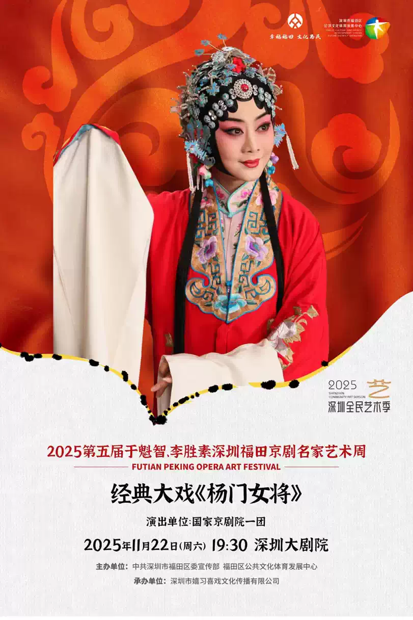 今年,正值深圳经济特区建立40周年,福田建区30周年之际,福田携手国家京剧院一团,弘扬传统文化,传承国粹经典,用经典京剧传承时代梦想,于12月23日呈献经典京剧《杨门女将》,作为深圳福田京剧名家艺术周的闭幕演出,由李胜素、张静、于魁智等多位国家一级演员领衔主演,分别扮演穆桂英、佘太君、宋仁宗,让市民在京剧欣赏中,弘扬民族艺术,传播国粹文化,一起推动福田京剧艺术发展,让更多人领略国粹京剧的不竭魅力。