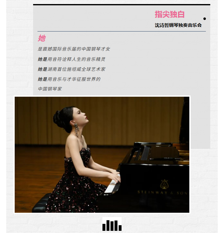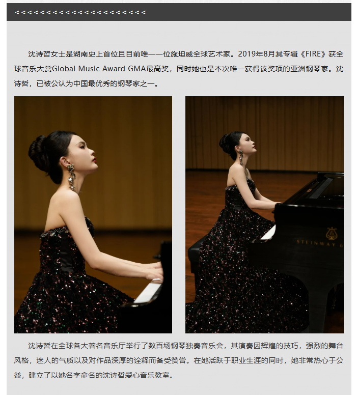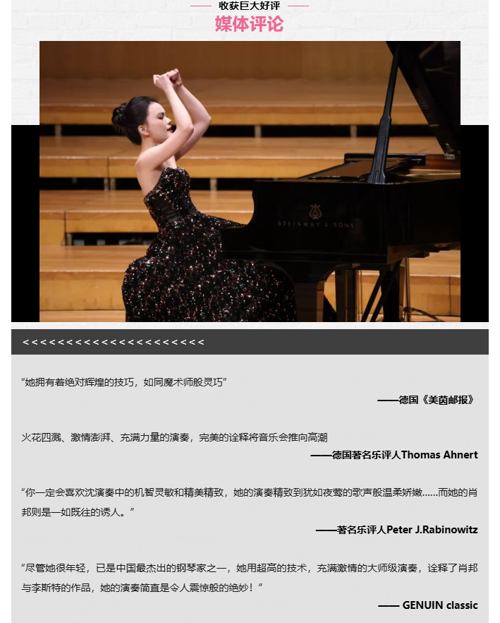 沈诗哲,尽管她很年轻,已是中国最杰出的钢琴家之一,这位施坦威艺术家为GENUIN唱片公司灌录的首张专辑证明了她为何能深受全世界的观众以及乐评人的喜爱与欣赏。她用超高的技术,充满激情的大师级演奏,诠释了肖邦与李斯特的作品—夜曲的喃喃细语,谐谑曲的生动闪烁,如魔鬼般燃烧的梅菲斯托,她的演奏简直是令人震惊般的绝妙!—GENUIN classic