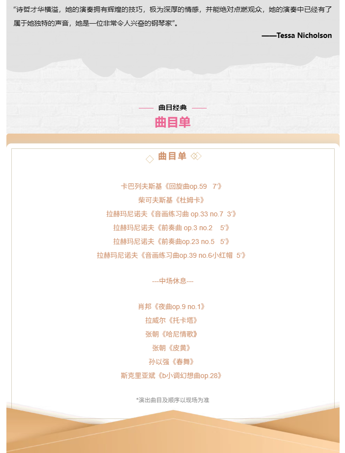 8.演出票仅限观看当天当场次演出,逾期失效,建议您提前一小时进行取票、并按时入场,迟到观众需等一个小曲目结束后,于曲目间才能入场。