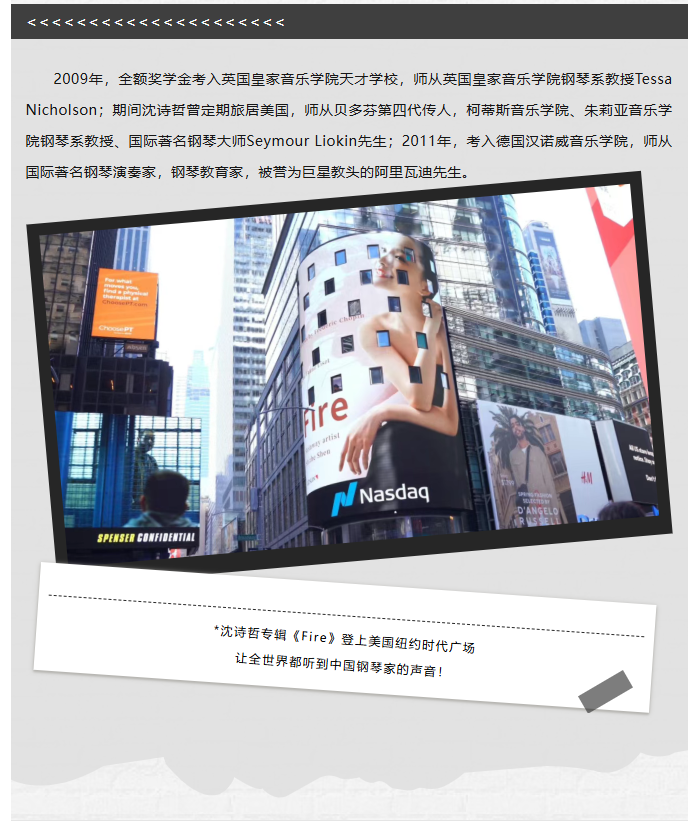 沈诗哲6岁开始学习钢琴,7岁开始登台演出,2009年,全额奖学金考入英国皇家音乐学院天才学校,期间曾定期旅居美国,师从贝多芬第四代传人,柯蒂斯音乐学院、朱莉亚音乐学院钢琴系教授、国际著名钢琴大师Seymour Lipkin先生。