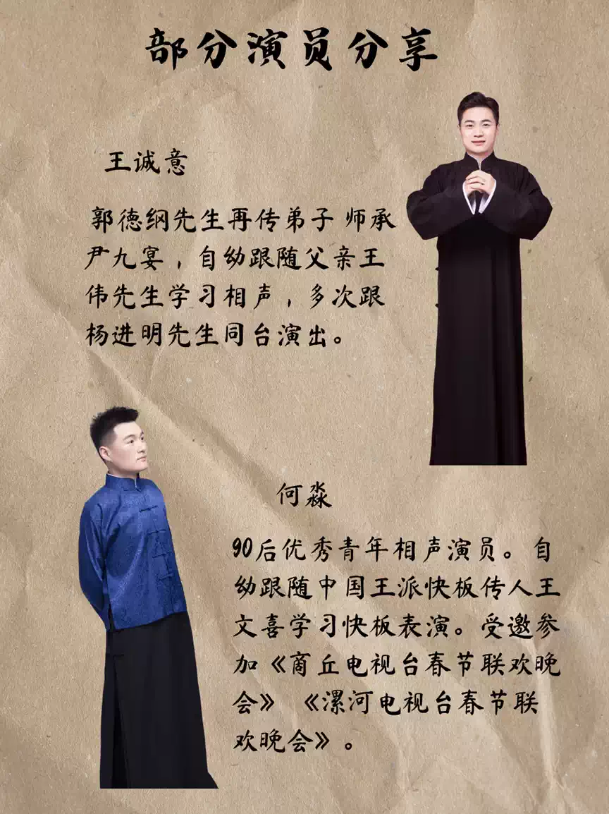 王诚意:郭德纲先生再传弟子 师承尹九宴,自幼跟随父亲王伟先生学习相声,多次跟杨进明先生同台演出,多次受著名表演艺术家指导,受邀参加蚌埠电视台2024春晚 河南电视台全明星春晚 夏邑电视台网络春晚。