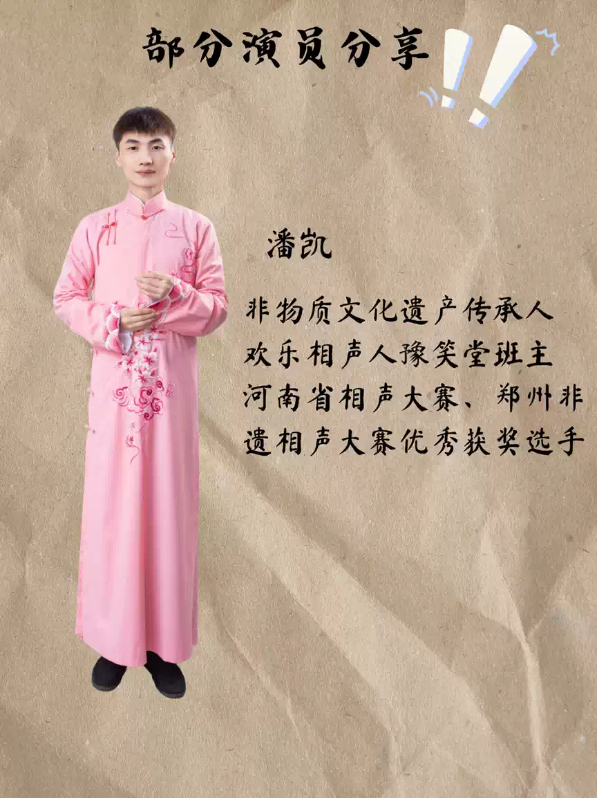欢乐相声人·豫笑堂是扎根河南本地的相声团队,同时是非物质文化遗产“倒口相声”传承演出团队,非遗传承人潘凯作为欢乐相声人·豫笑堂发起人一直秉持着对这一非遗艺术的赤诚热爱,深深扎根于中原大地这片文化底蕴深厚的土壤。欢乐相声人·豫笑堂团队深知非遗相声传承的责任重大,不仅从传统相声中精心汲取灵感与养分,还紧跟时代步伐,大胆创新,让古老的相声艺术在新时代焕发出全新的活力。从最初的小范围演出,到如今备受关注,他们用一场场精彩的表演,赢得了观众的喜爱与认可,也为非遗相声的传承与发展贡献着自己的力量。